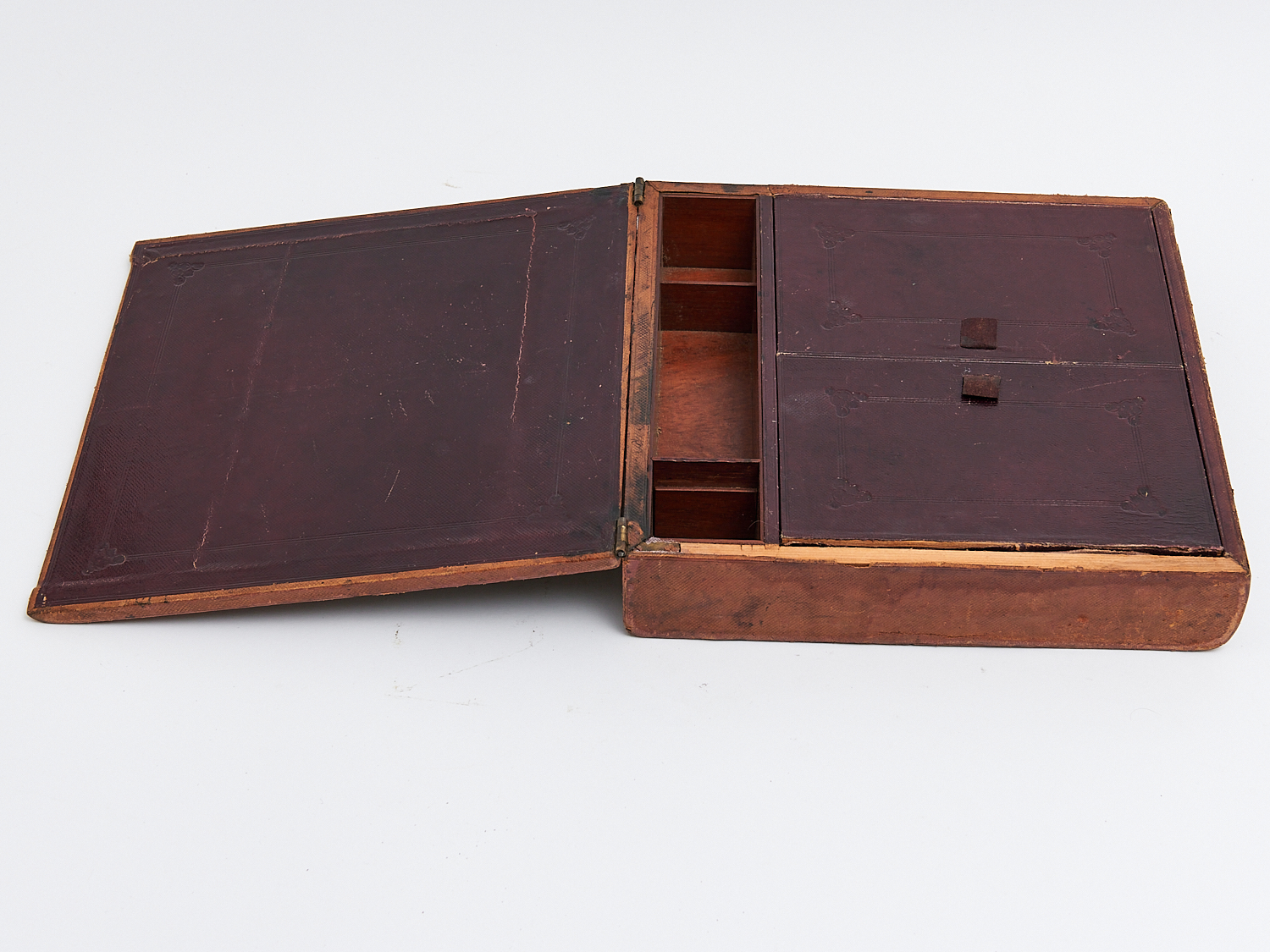 A 19TH CENTURY LEATHER FOLDING TRAVELLING WRITING SLOPE, W.26CM X D.28CM, LEONARD JOEL LOCAL DELIVERY: MEDIUM