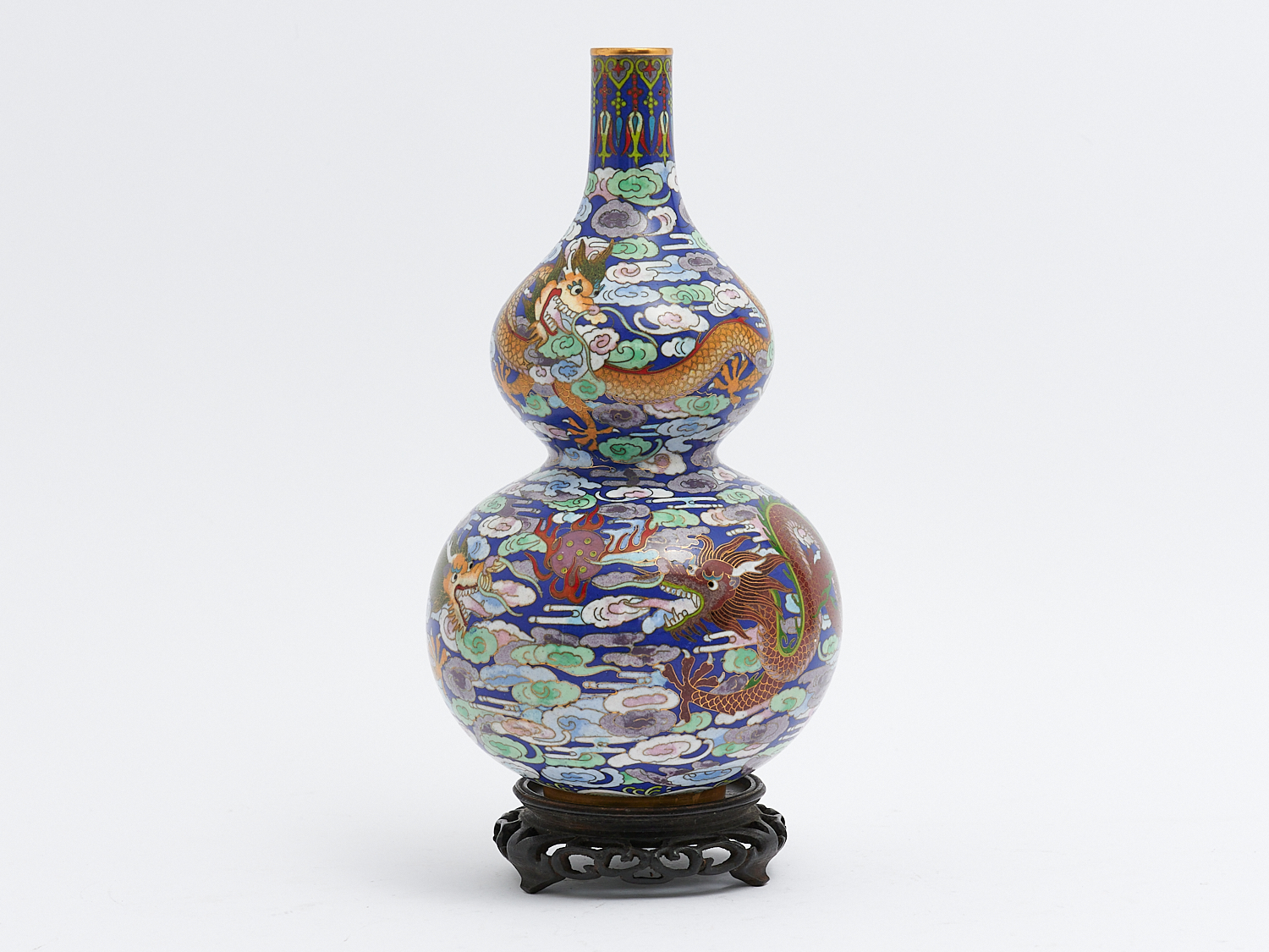 A CHINESE DRAGON ADORNED CLOISONNE DOUBLE GOURD FORM VASE ON WOODEN STAND, H.26CM, LEONARD JOEL LOCAL DELIVERY: SMALL