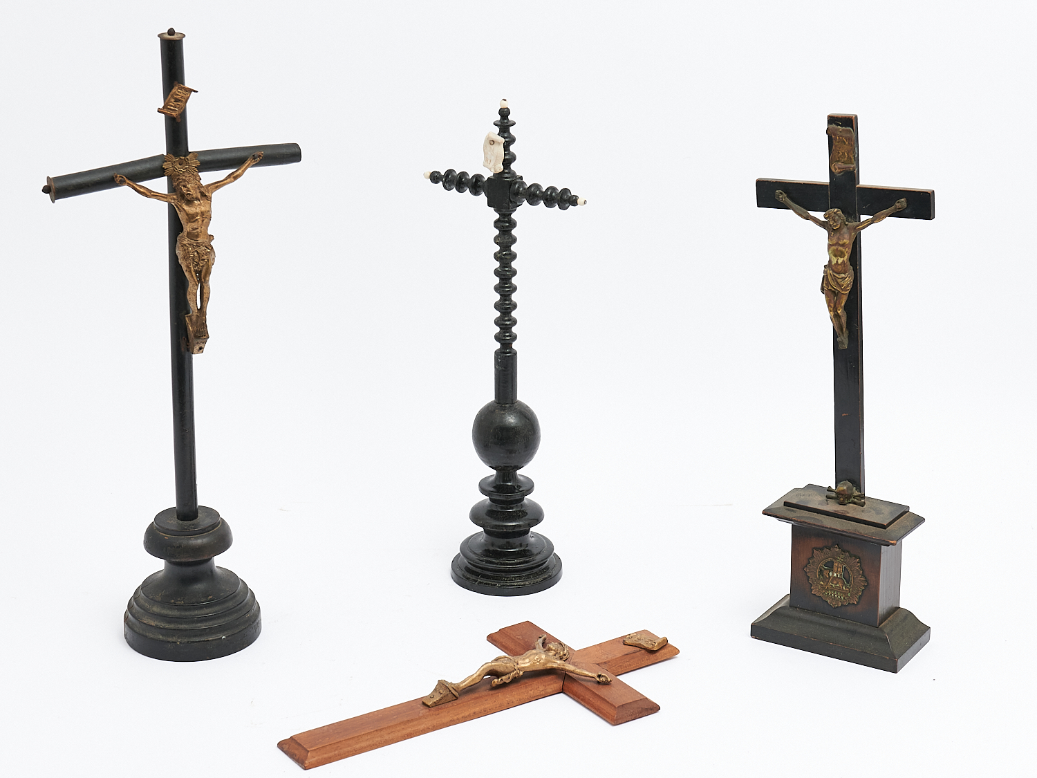 A COLLECTION OF FOUR ANTIQUE AND VINTAGE CRUCIFIXES (A/F), H.45CM, LEONARD JOEL LOCAL DELIVERY: SMALL