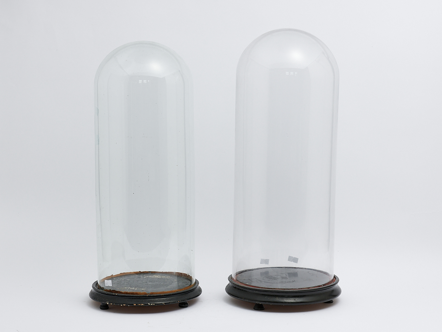 A PAIR OF 19TH CENTURY FRENCH EBONISED WOOD BASED DISPLAY DOMES, H.55CM (TALLEST), LEONARD JOEL LOCAL DELIVERY: MEDIUM