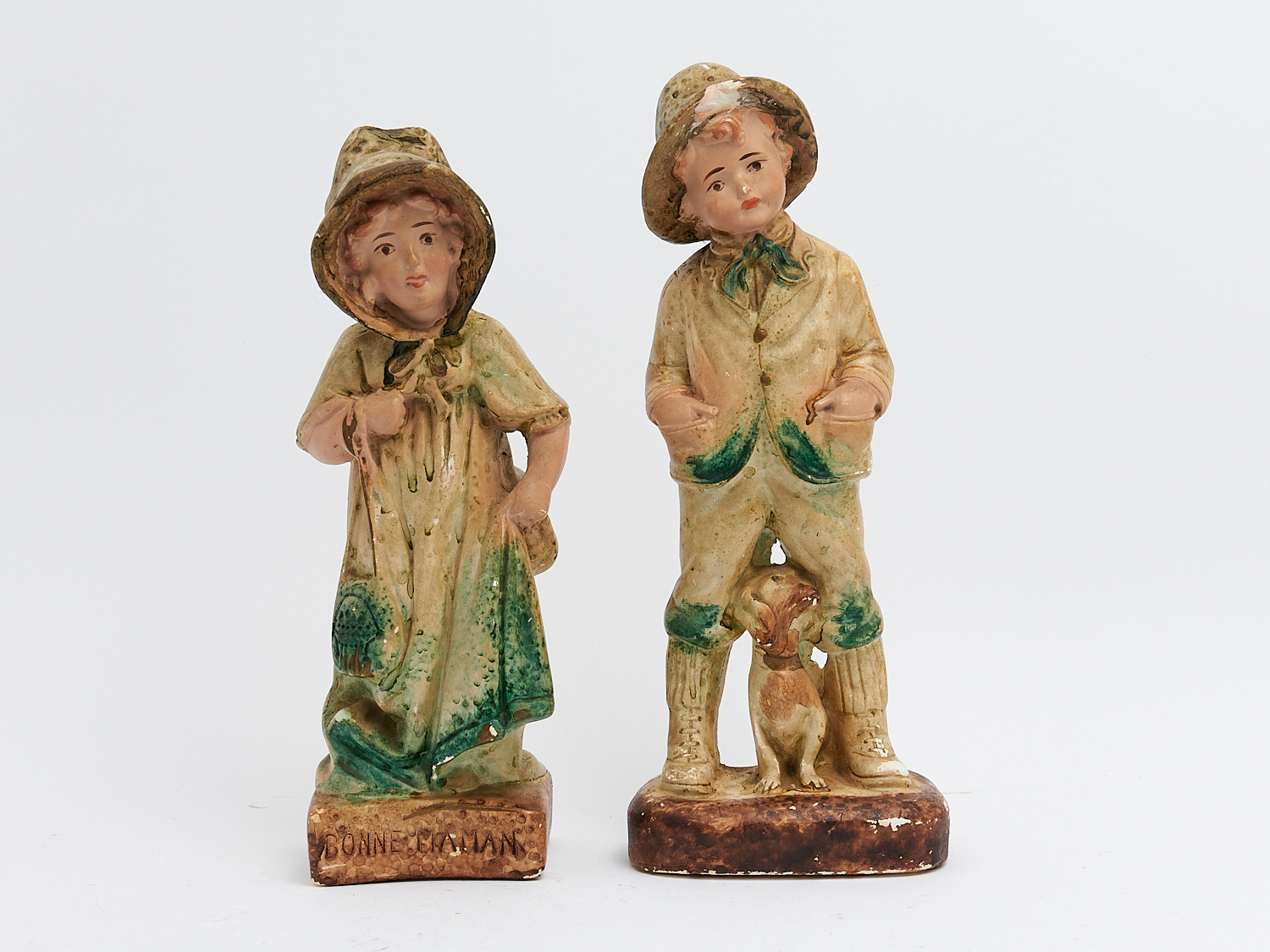 A PAIR OF HANDPAINTED PLASTER FIGURES (A/F) H.39CM, LEONARD JOEL LOCAL DELIVERY: MEDIUM
