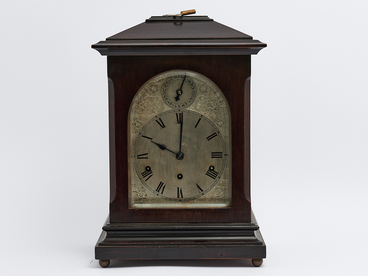 A MAHOGANY CASED CHIMING BRACKET CLOCK H.42CM, LEONARD JOEL LOCAL DELIVERY: MEDIUM