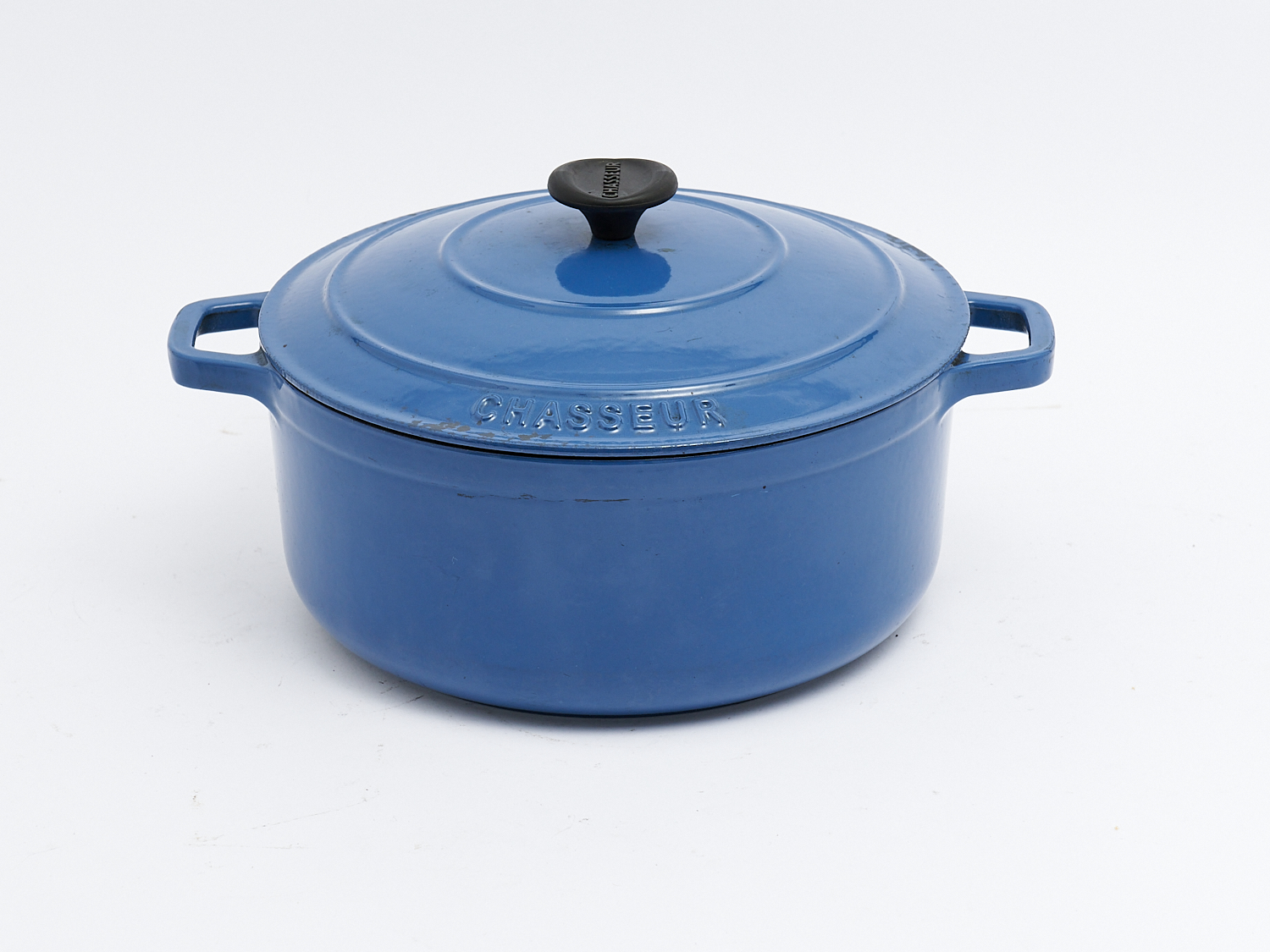 A CHASSEUR LARGE BLUE ENAMEL TWO HANDLED LIDDED CASSEROLE, DIA.27CM, LEONARD JOEL LOCAL DELIVERY: MEDIUM