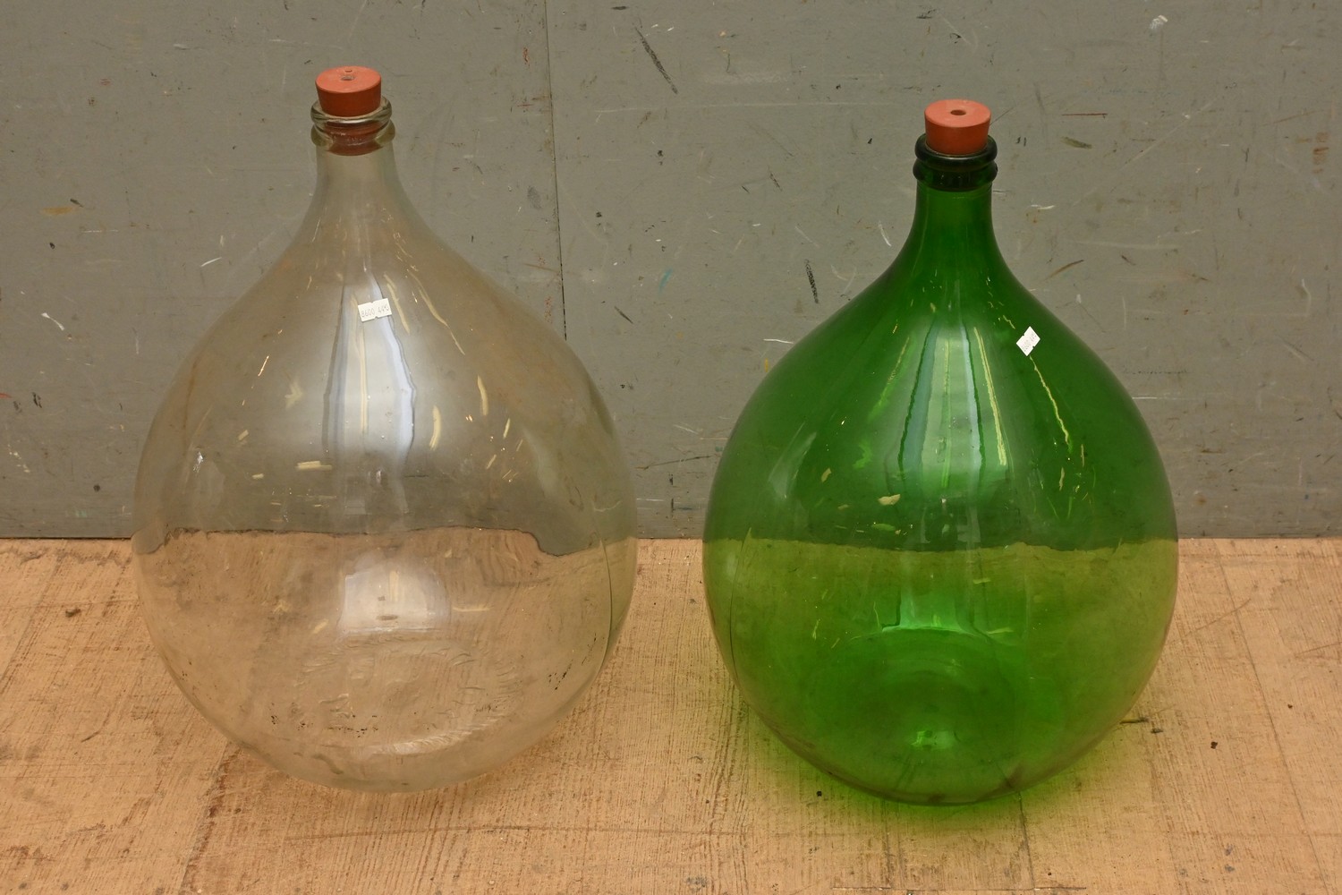 TWO ITALIAN CLEAR AND GREEN GLASS DEMIJOHNS (H60 X D40 CM) (LEONARD JOEL DELIVERY SIZE: LARGE)