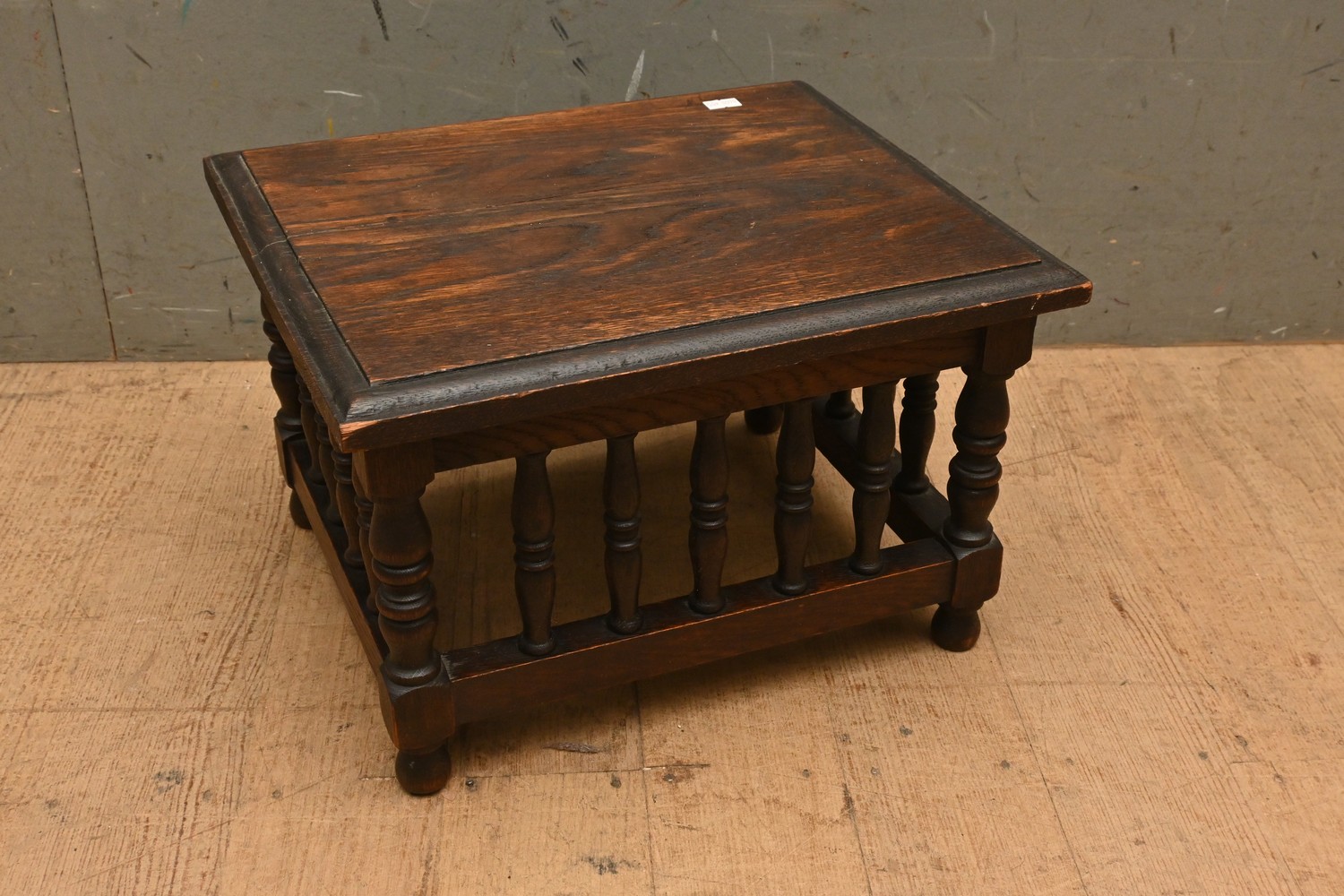 AN ANTIQUE ENGLISH OAK SPINDLE SIDE STOOL/DISPLAY STAND (25H X 39W X 32D CM) (LEONARD JOEL DELIVERY SIZE: SMALL)
