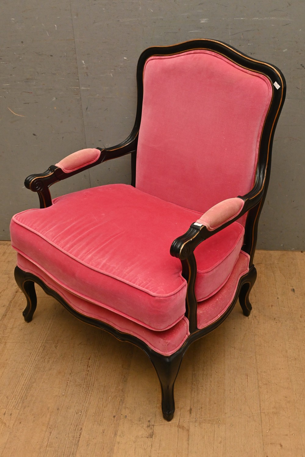 A LOUIS XV STYLE PINK VELVET ARMCHAIR (A/F) ( 95H X 66W X 70D CM) (LEONARD JOEL DELIVERY SIZE: LARGE)