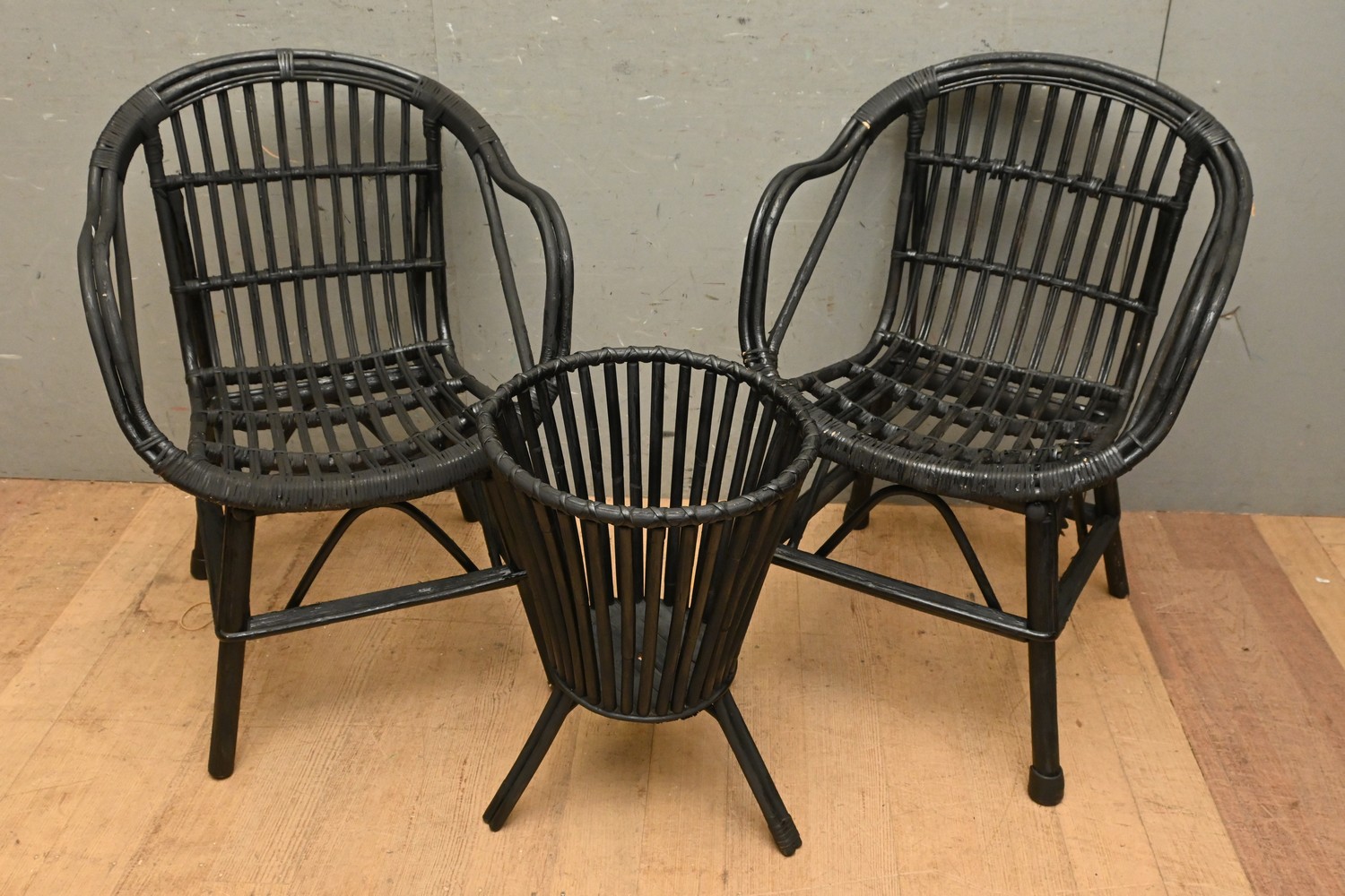 PAIR OF VINTAGE BLACK CANE ARMCHAIRS AND BLACK CANE PLANTER STAND (A/F) ( 83H X 60W X 61D CM) (LEONARD JOEL DELIVERY SIZE: LARGE)