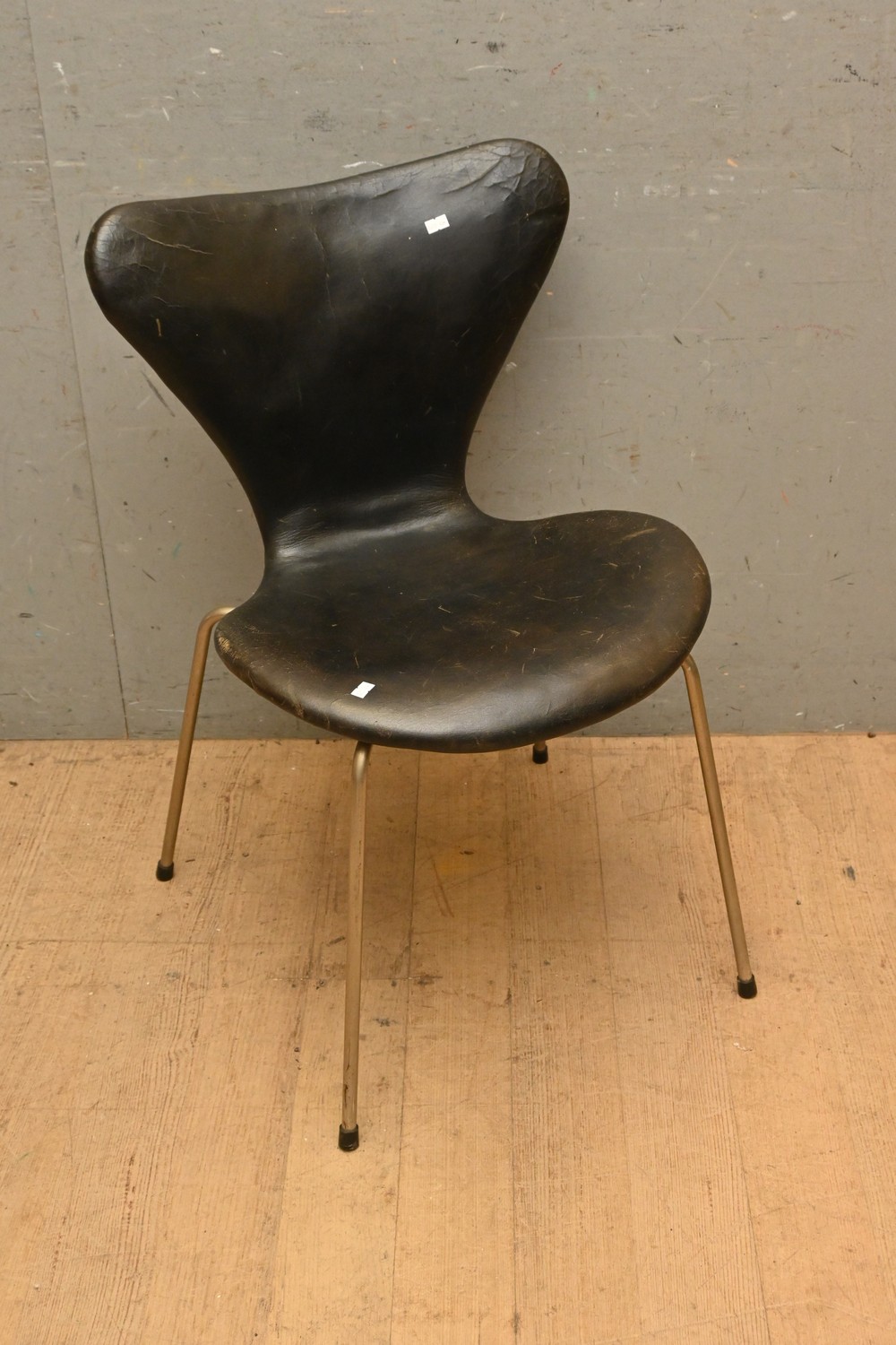 A MID CENTURY FRITZ HANSEN LEATHER CHAIR (A/F) ( 78H X 51W X 48D CM) (LEONARD JOEL DELIVERY SIZE: LARGE)