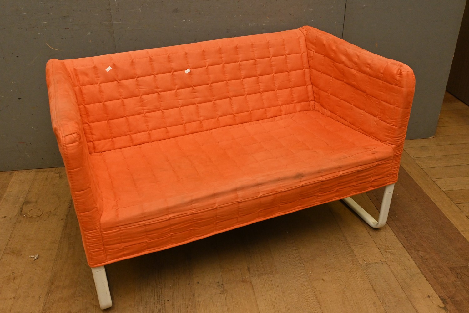 A CONTEMPORARY WHITE STEEL FRAMED ORANGE TWO SEATER LOUNGE (A/F) ( 70H X 122W X 78D CM) (LEONARD JOEL DELIVERY SIZE: X-LARGE)