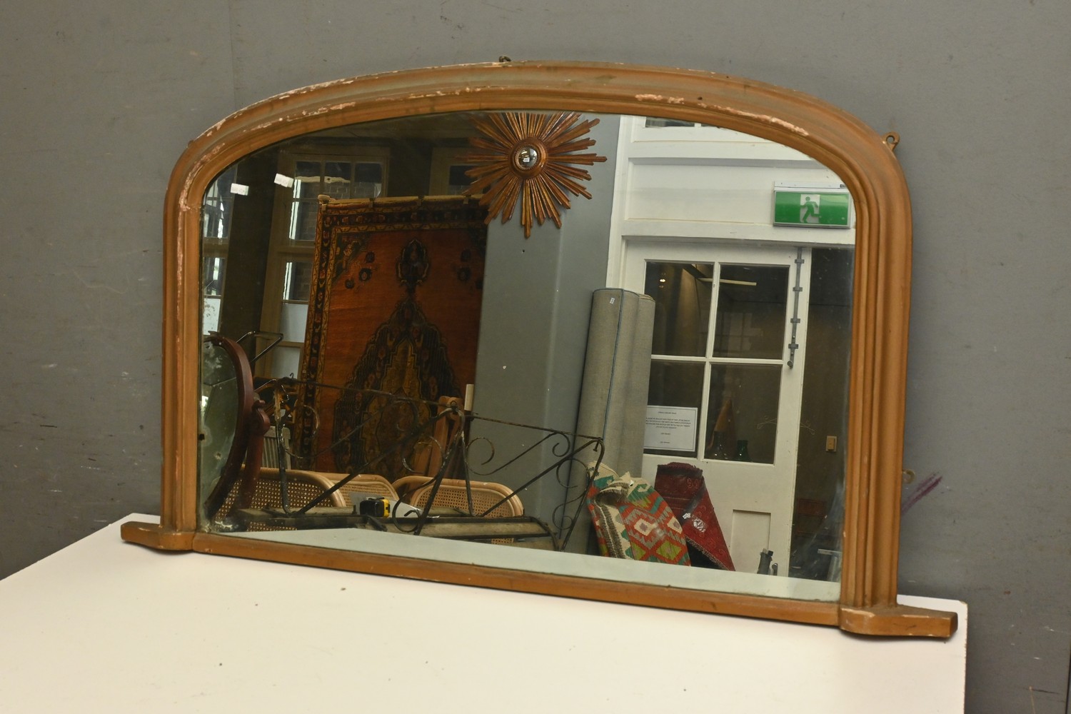 A 19TH CENTURY GILT CURVE TOPPED WOODEN MANTLE MIRROR (A/F) (67H X 115W CM) (LEONARD JOEL DELIVERY SIZE: LARGE)