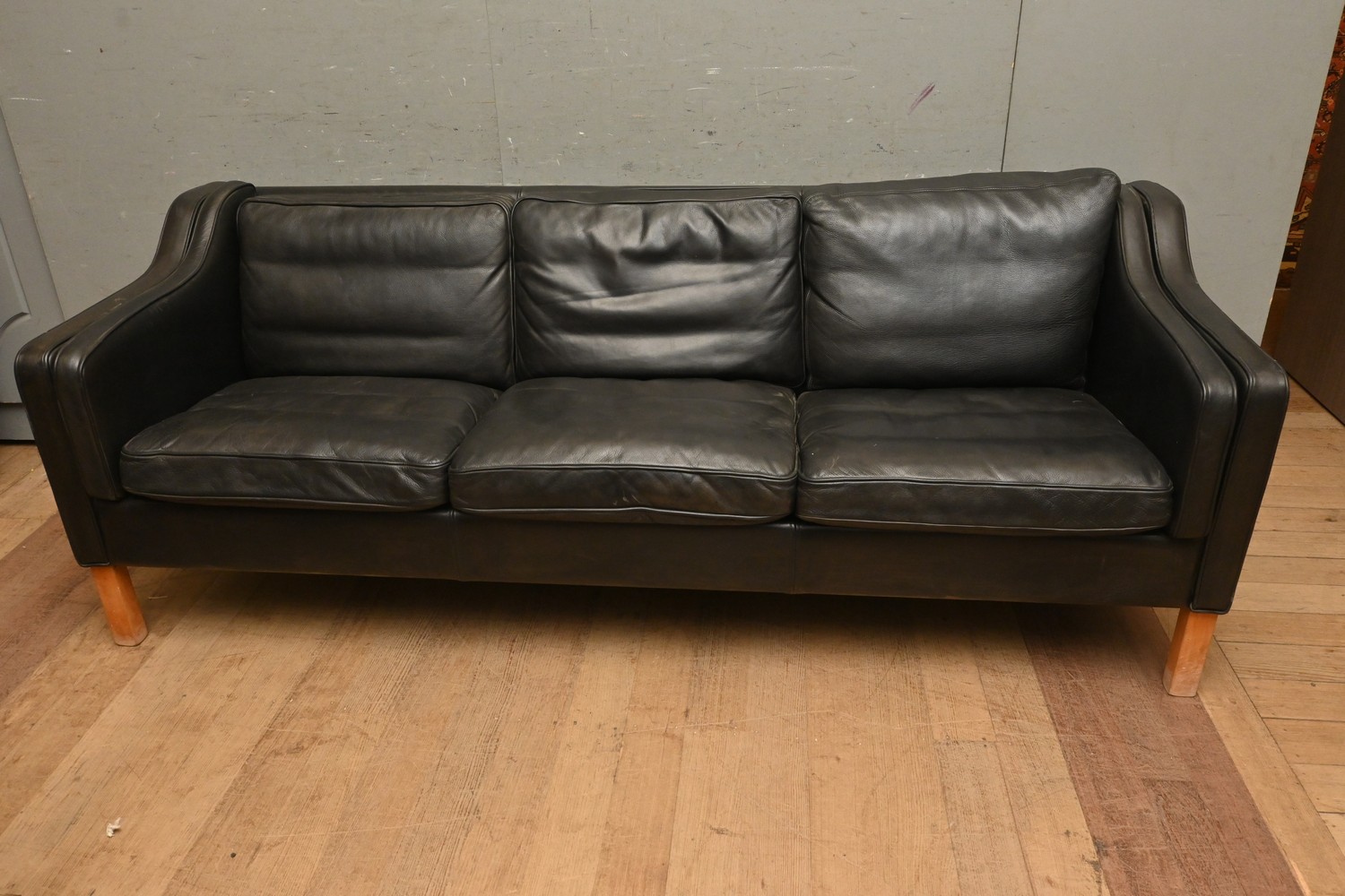A MOGENS HANSEN THREE SEATER LEATHER SOFA (A/F) (78H X 212W X 79D CM) (PLEASE NOTE THIS HEAVY ITEM MUST BE REMOVED BY CARRIERS AT THE CUSTOMER'S EXPENSE. LEONARD JOEL STAFF CANNOT ASSIST CARRYING THIS ITEM) (X-LARGE ITEM)