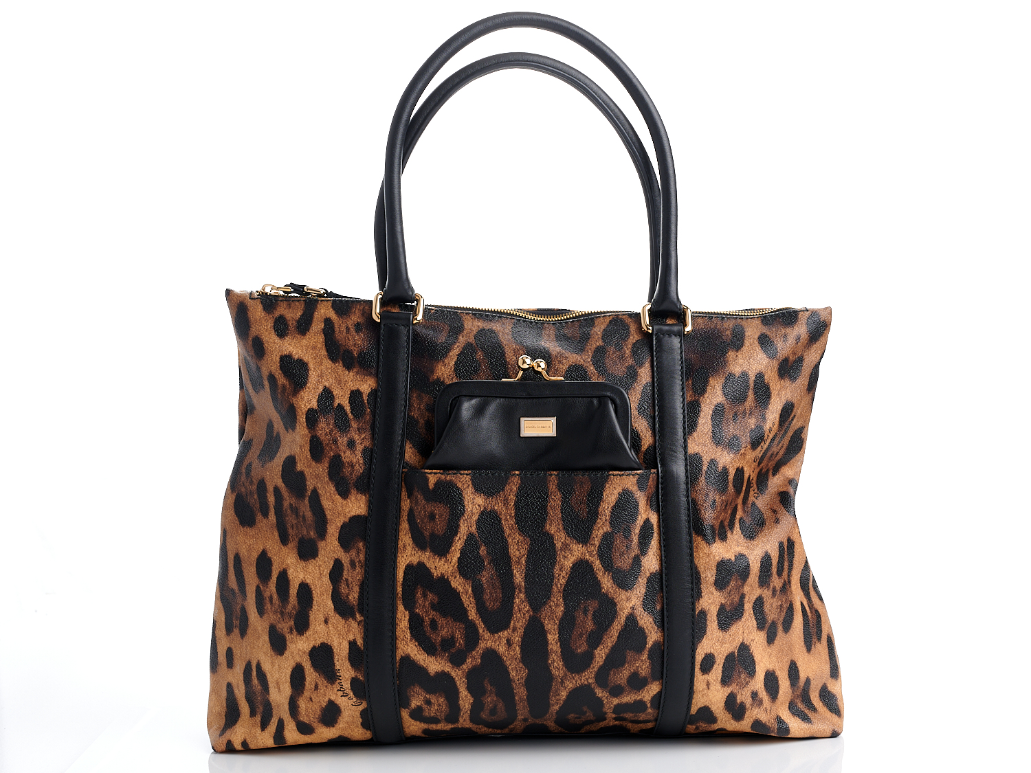 Styled in ocelot canvas with black leather trim and gold tone metal hardware, 40 x 31 x 8cm.