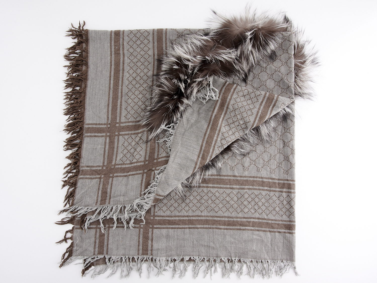 GUCCI, WOOL & SILK SHAWL - The triangular shawl with monogram design, fur trim and tassel finish, 184 x 124 x 124cm.