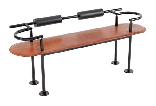Tubular powder coated steel frame, saddle hide leather bench seat and rubber.
