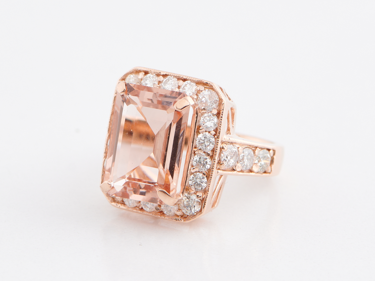 A MORGANITE AND DIAMOND SET RING IN 18CT ROSE GOLD, THE MORGANITE WEIGHING 6.70CTS, THE DIAMONDS TOTALLING APPROXIMATELY 2.16CTS, RING SIZE M-N, WEIGHT 8.8GMS, WITH VALUATION
