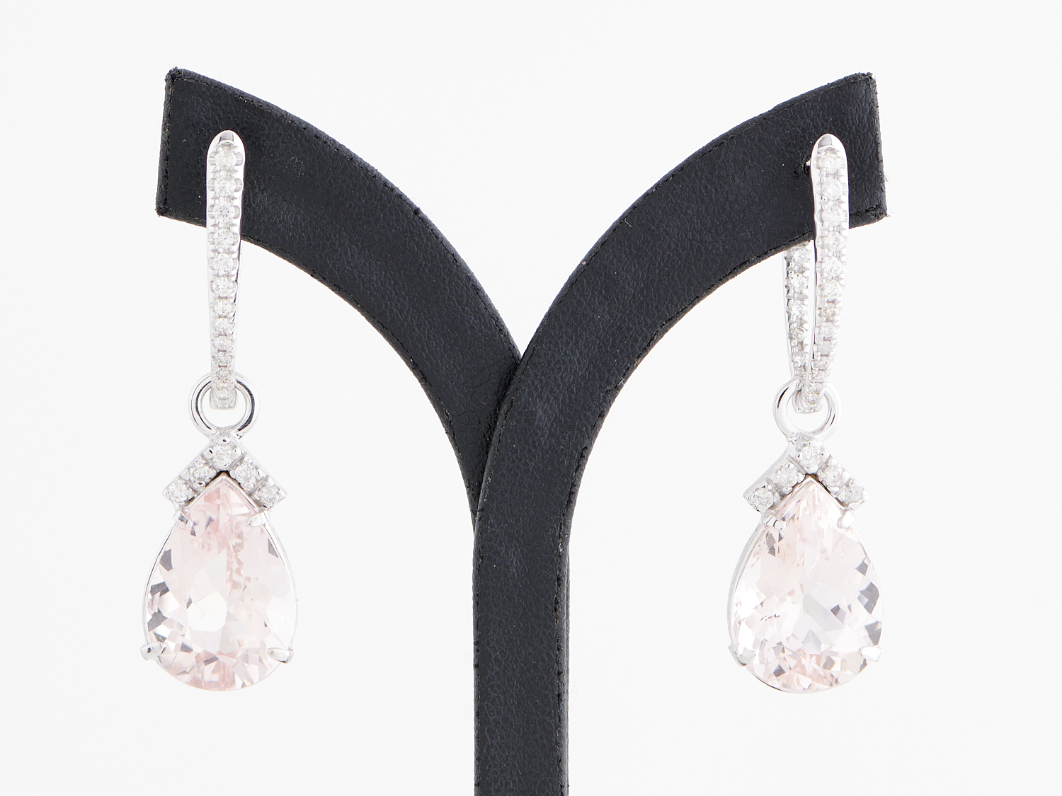 A PAIR OF DEDATCHABLE PINK MORGANITE AND DIAMOND EARRINGS IN 18CT WHITE GOLD TO POST AND CLASP FITTINGS, THE MORGANITES TOTALLING APPROXIMATELY 16.74CTS, THE DIAMONDS TOTALLING APPROXIMATELY 1.10CTS, SIZE 12.3 X 43MM, WEIGHT 11.5GMS, WITH VALUATION