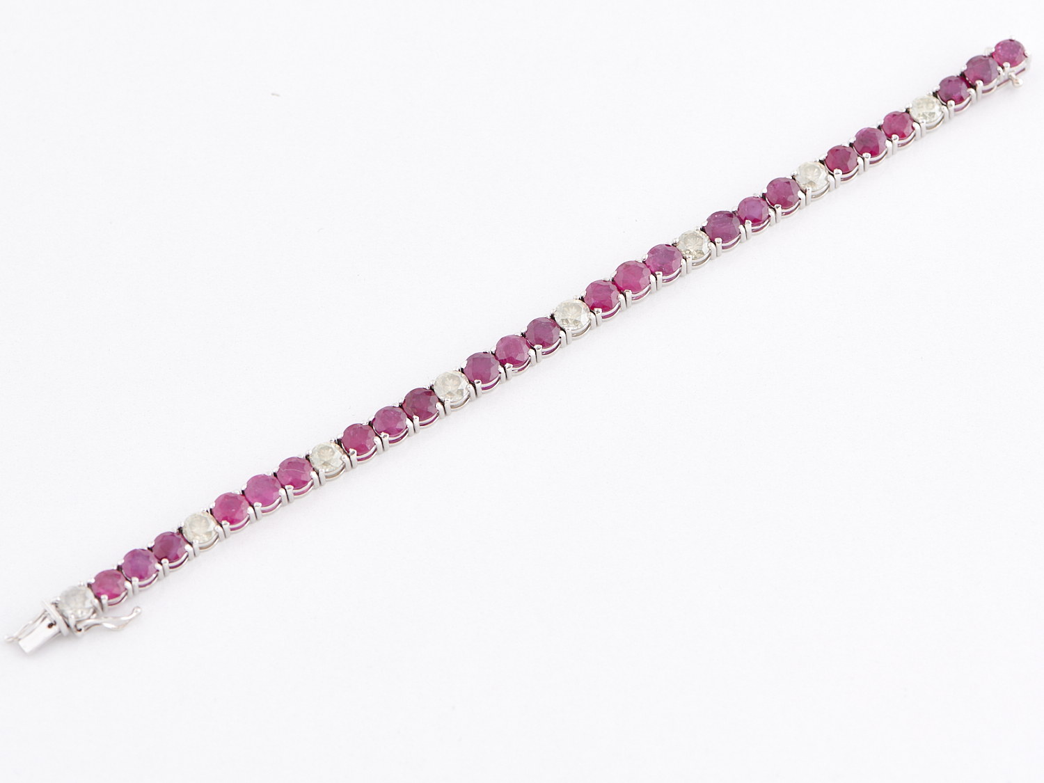 A RUBY AND DIAMOND SET TENNIS BRACELET IN 18CT WHITE GOLD, THE RUBIES TOTALLING APPROXIMATELY 19.20CTS, THE DIAMONDS TOTALLING APPROXIAMTELY 5.08CTS, LENGTH 175MM, WEIGHT 19.4GMWS, WITH VALUATION