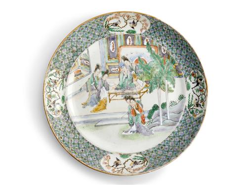 Decorated in Kangxi style with figures in a garden pavillion, the border with reserves containing birds against a diaper ground.