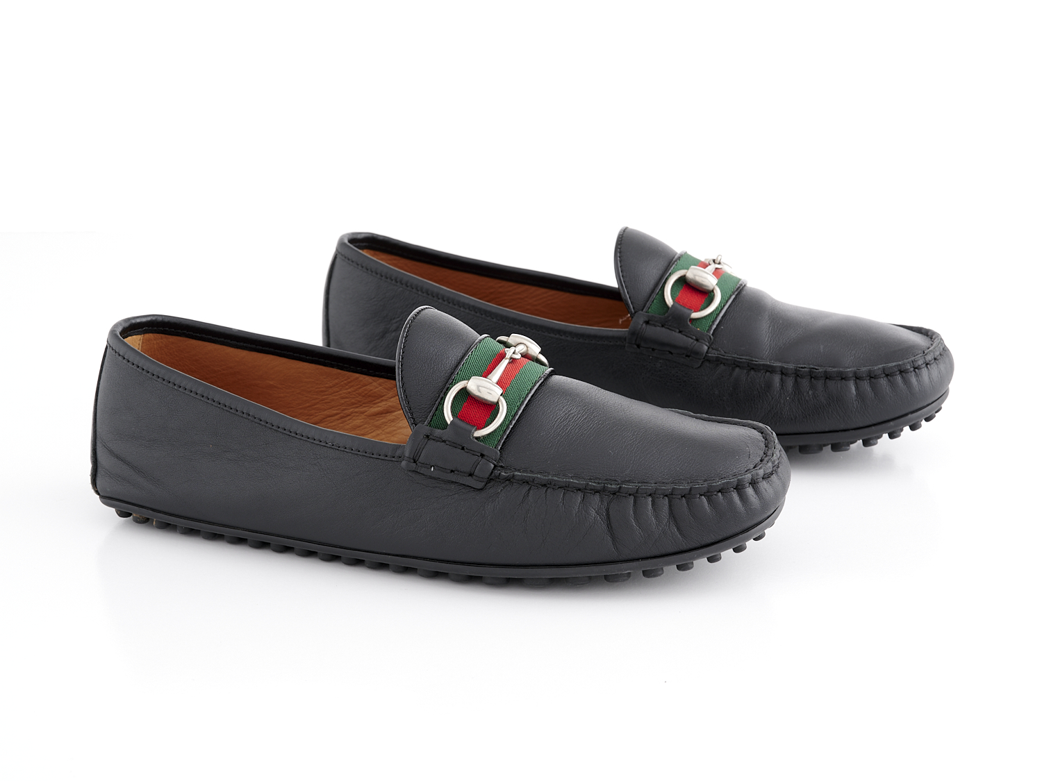 GUCCI, PAIR OF MOCCASINS - Styled in black leather with red and green grosgrain detail, labelled size 9, with box.