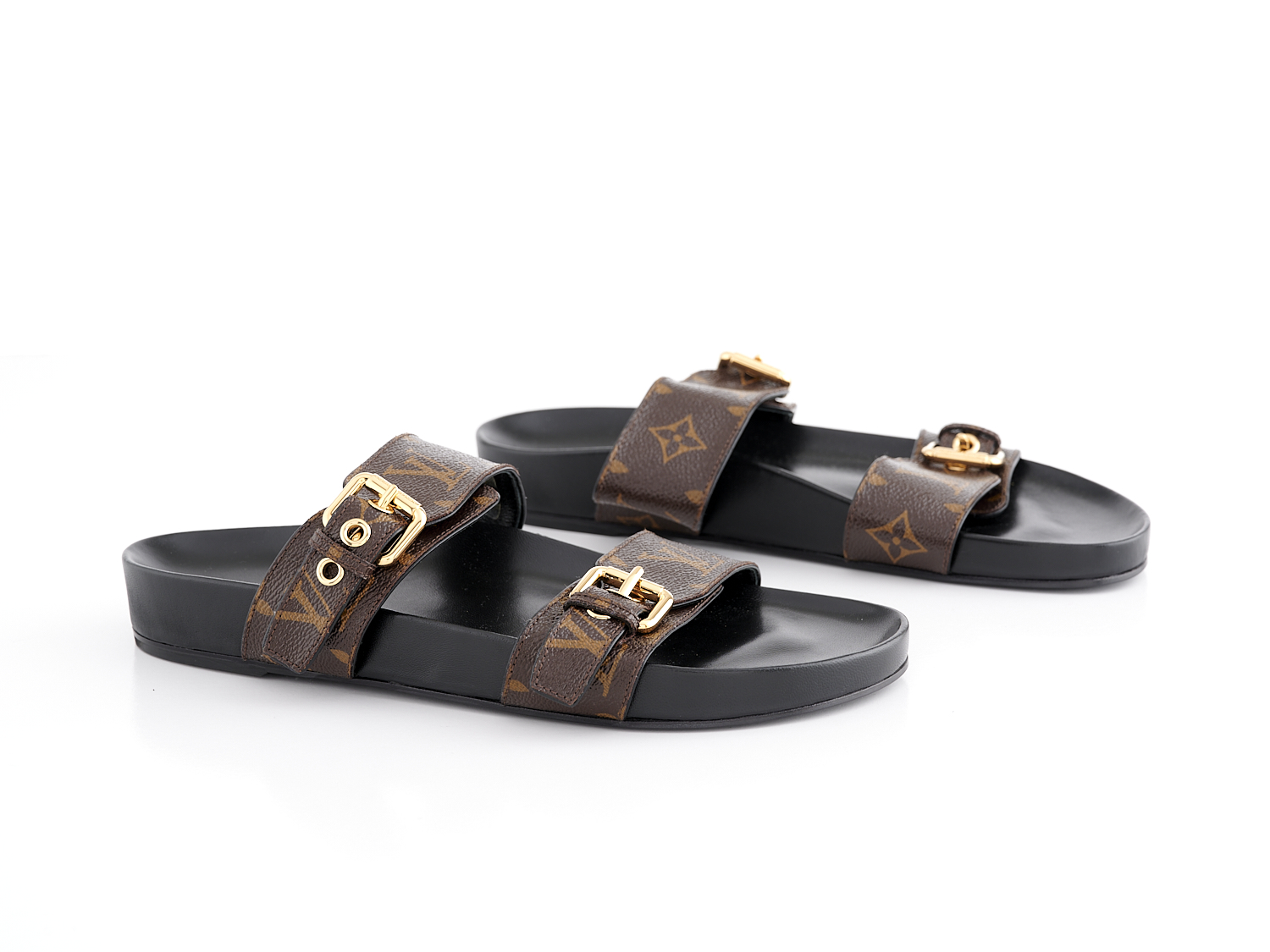 LOUIS VUITTON, PAIR OF SLIDES - Styled in monogram coated canvas with rubber sole, labelled size 39.5