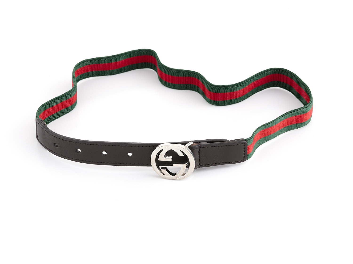GUCCI, BELT - Styled green and red elastic with black leather and GG silver tone metal buckle, width 2.5cm.