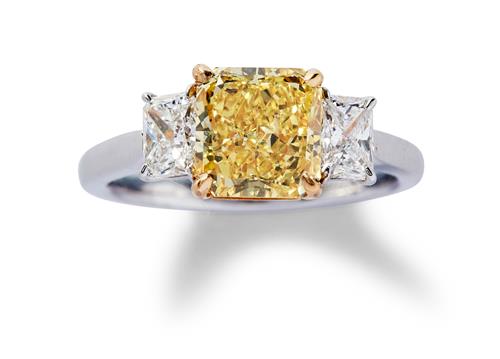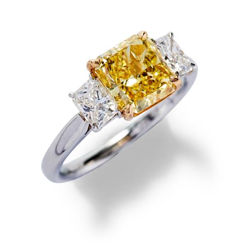 The cushion-shaped fancy vivid yellow diamond weighing 2.19 carats, is claw-set between a pair of near colourless radiant-cut diamonds, the small diamonds together weighing approximately 0.68 carats, mounted in platinum and 18ct gold, size L1/2.