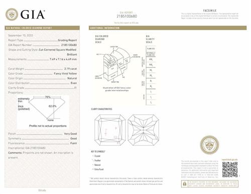 Accompanied by a GIA report numbered 2185100680, dated 15 September 2022, stating that the 2.19 carat diamond is natural, fancy vivid colour, I1 clarity, laser inscribed.