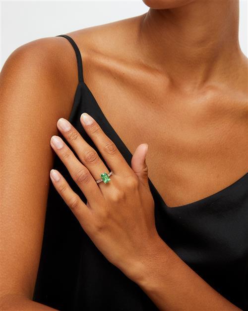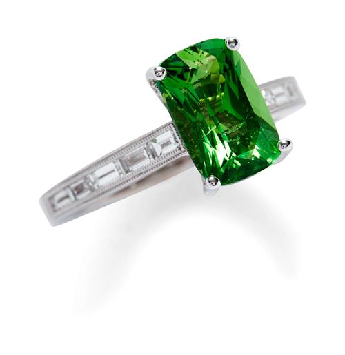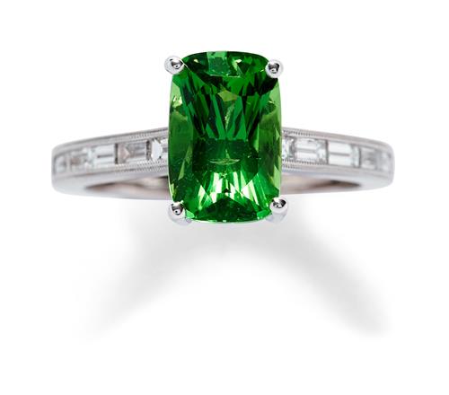 The cushion-shaped demantoid garnet weighing approximately 3.04 carats, is claw-set between shoulders channel-set with baguette diamonds, mounted in 18ct white gold, size M1/2.