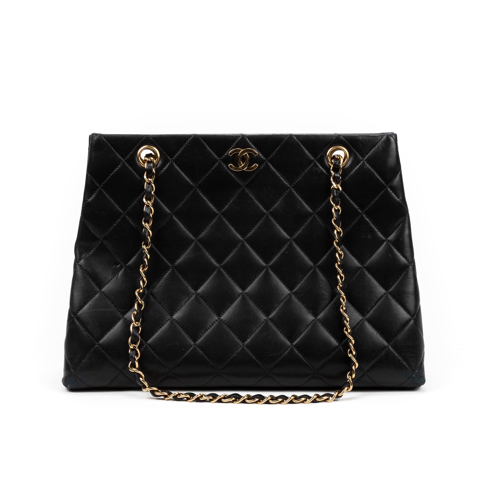 CHANEL, VINTAGE STRAIGHT SINGLE FLAP SHOULDER BAG - Styled in black quilted lambskin leather with interlaced chain shoulder strap an...
