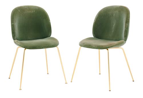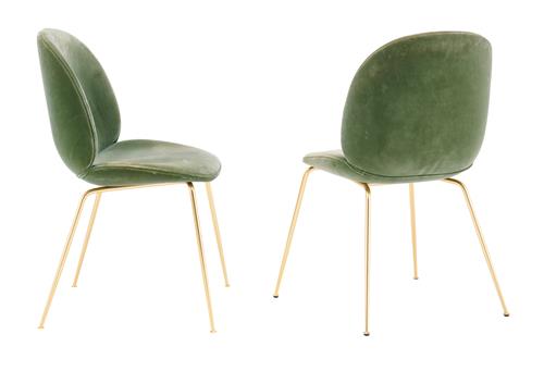 Green velvet upholstery on semi matt brass base frame with conical legs.