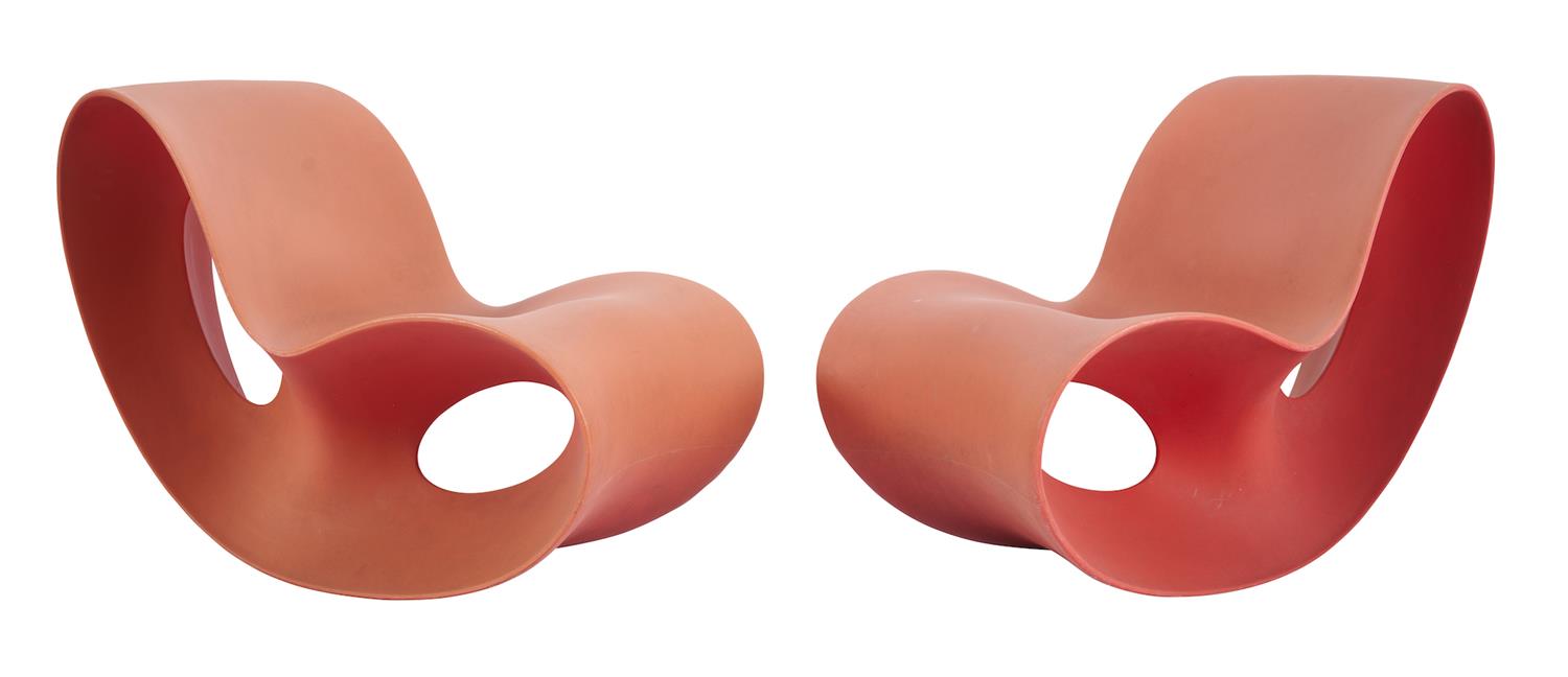 Sun fading overall to both chairs, consistent with outdoor use. Surface marks, scratches and residue to both, also as expected for outdoor furniture, consistent with age and use. One chair has an approx 2 cm cut to the right hand side. Both chairs rock comfortably.