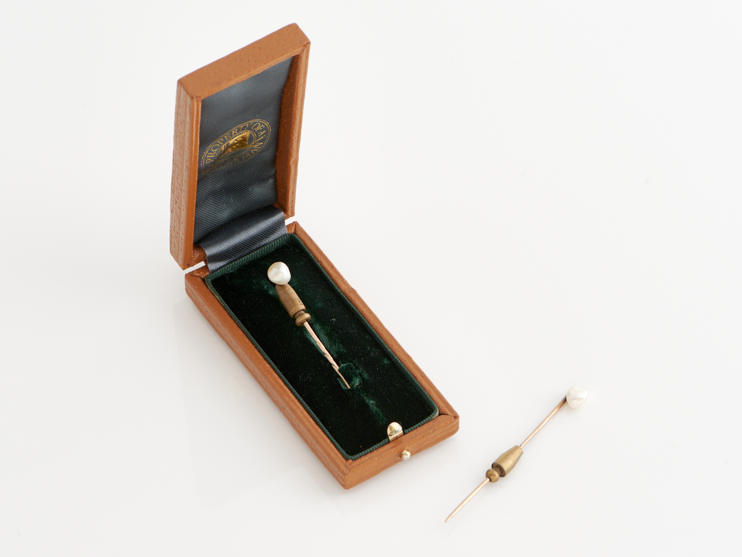 TWO FRESHWATER PEARL SET STICKPINS IN 9CT GOLD, TO KEEPERS IN BRASS, LENGTH 65MM, BOXED