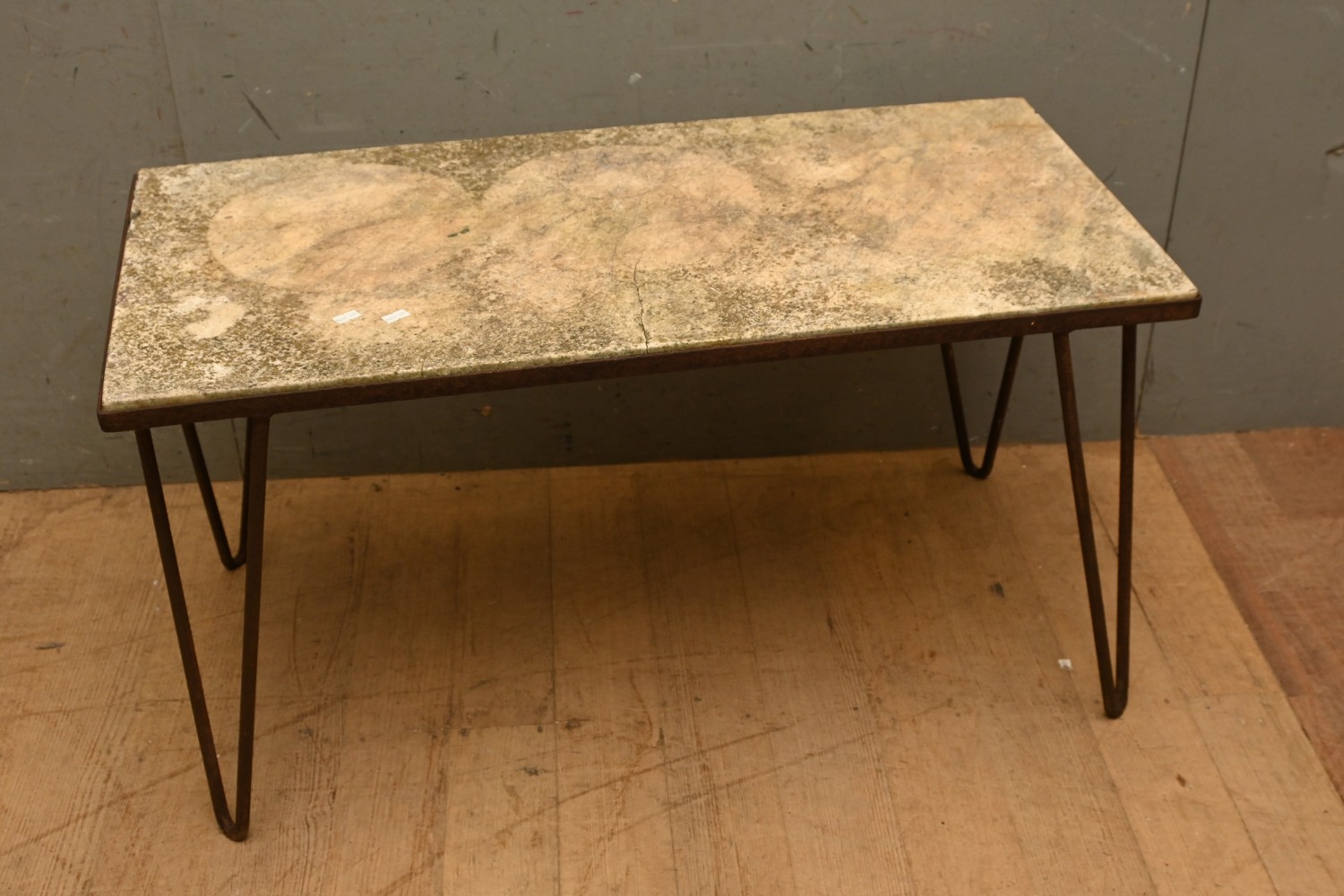 A 1920S AUSTRALIAN WROUGHT IRON BASED MARBLE TOP RECTANGULAR GARDEN COFFEE TABLE (A/F) ( 49H X 91W X 45D CM) (PLEASE NOTE THIS HEAVY ITEM MUST BE REMOVED BY CARRIERS AT THE CUSTOMER'S EXPENSE. LEONARD JOEL STAFF CANNOT ASSIST CARRYING THIS ITEM) (X-LARGE ITEM)