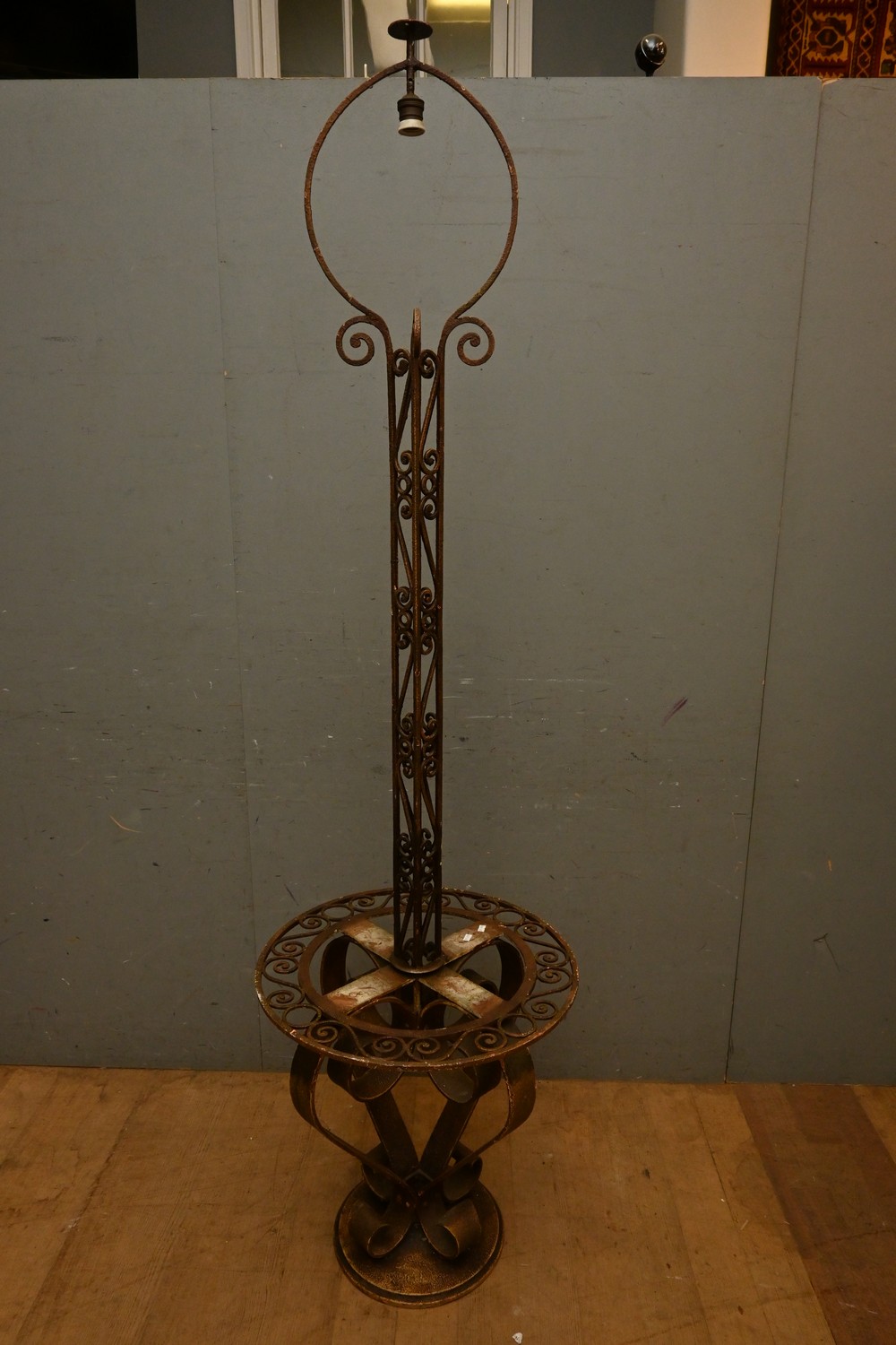 A WROUGHT IRON STANDARD LAMP TABLE – MISSING GLASS TOP (A/F) ( 202H X 55 DIAMETER CM) (PLEASE NOTE THIS HEAVY ITEM MUST BE REMOVED BY CARRIERS AT THE CUSTOMER'S EXPENSE. LEONARD JOEL STAFF CANNOT ASSIST CARRYING THIS ITEM) (X-LARGE ITEM)