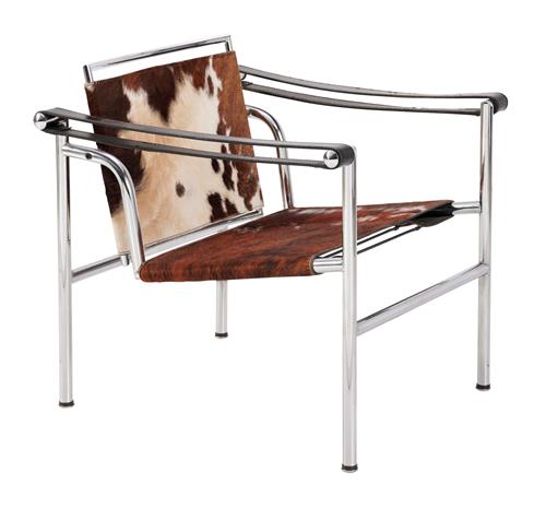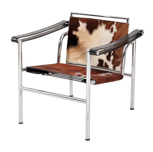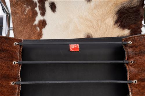 Cowhide upholstery on tubular steel frame that supports the sling seat and armrests.