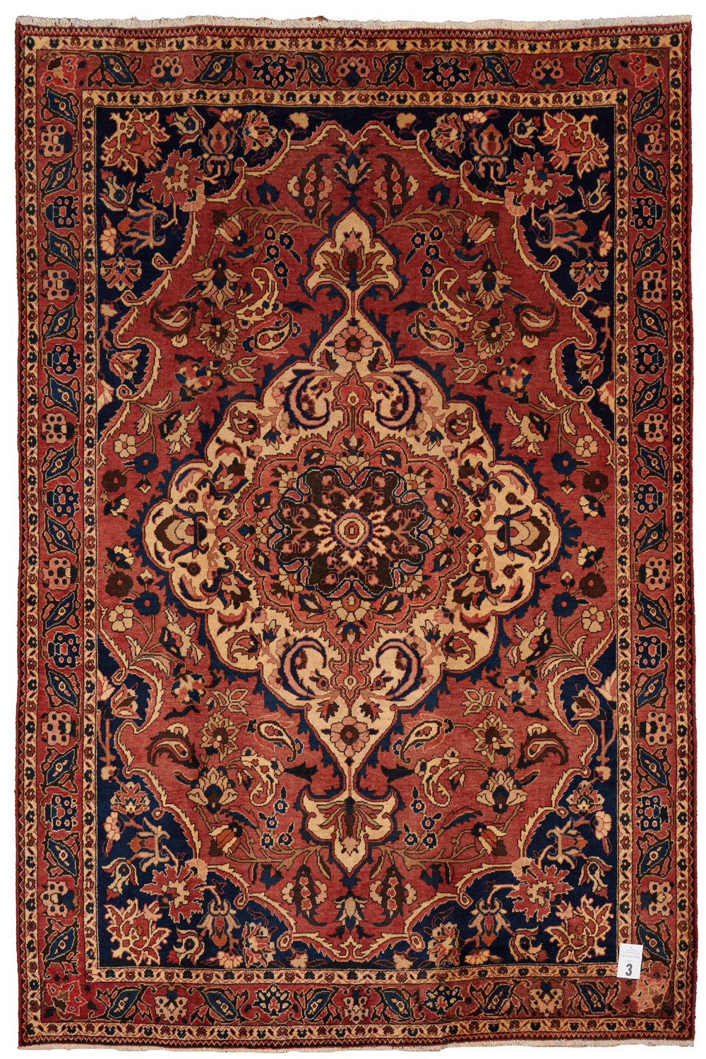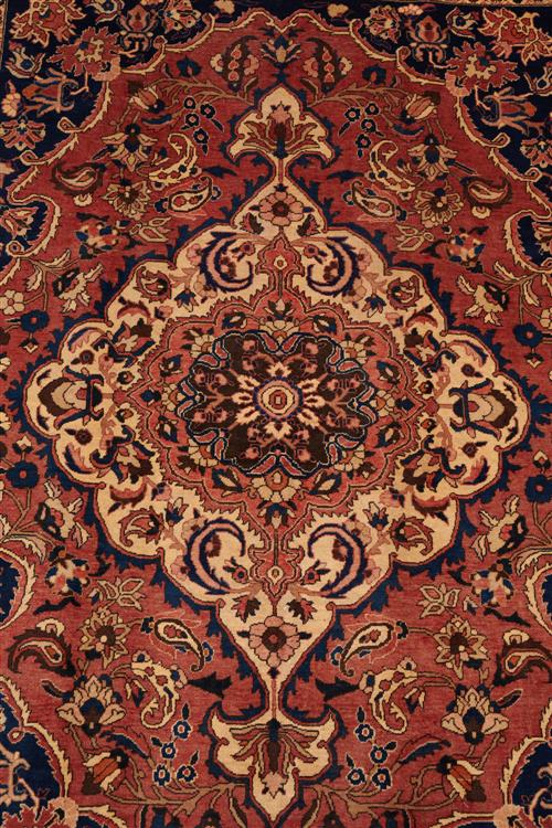 PERSIAN BAKHTIAR SAMAN RUG, 100% WOOL. HAND KNOTTED TRIBAL BAKHTIARI WEAVE AND DESIGN OF BOLD ANCHORED FLORAL MEDALLION AND QUARTERED CORNER MEDALLIONS IN A SUBTLE RED FIELD OF FLORAL MOTIFS AND TENDRILS. BORDER OF PAISLEY AND TENDRILS. SOFT MELLOW TONES ALL OVER. SIZE: 317 X 210 CM ORIGIN PERSIA- RRP: $4,200 DOCUMENTATION OF AUTHENTICITY INCLUDED.