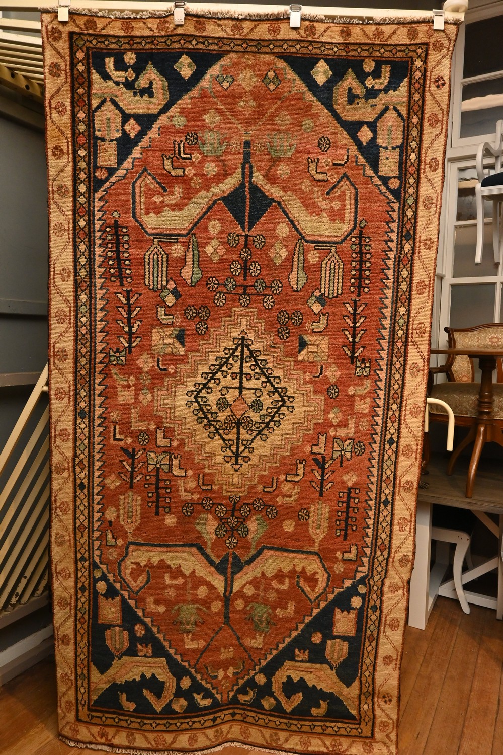 A VINTAGE TRIBAL PERSIAN LURI RUG, 100% WOOL, NATURAL DYES. TRIBAL WEAVE & DESIGN OF DIAMOND MEDALLION ON A MADDER TONED FIELD OF TREE OF LIFE, MOTIFS, ROSETTES, AND GEOMETRIC MOTIFS. SIZE: 250 X 130 CM ORIGIN: IRAN - RRP: $2,100 DOCUMENTATION OF AUTHENTICITY INCLUDED.