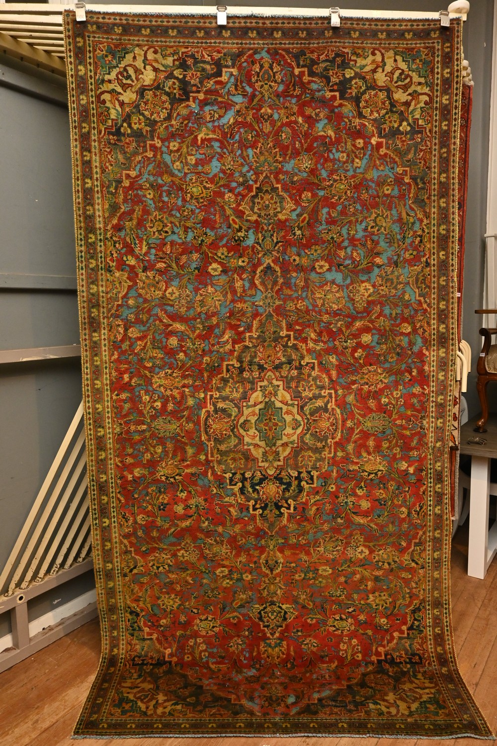 AN ATTRACTIVE VINTAGE OVER-DYED PERSIAN KASHAN CARPET, VINTAGE PILE. A UNIQUE MODERN CARPET CREATED FROM AN AUTHENTIC VINTAGE ALL-OVER DESIGN KASHAN CARPET WITH THE PILE SHORN AND OVER-DYED IN RED, GREEN & BLUE TONES. SOME RESTORATION. (A/F) SIZE: 283 X 143 CM ORIGIN: PERSIA - RRP: $1,900 DOCUMENTATION OF AUTHENTICITY INCLUDED.