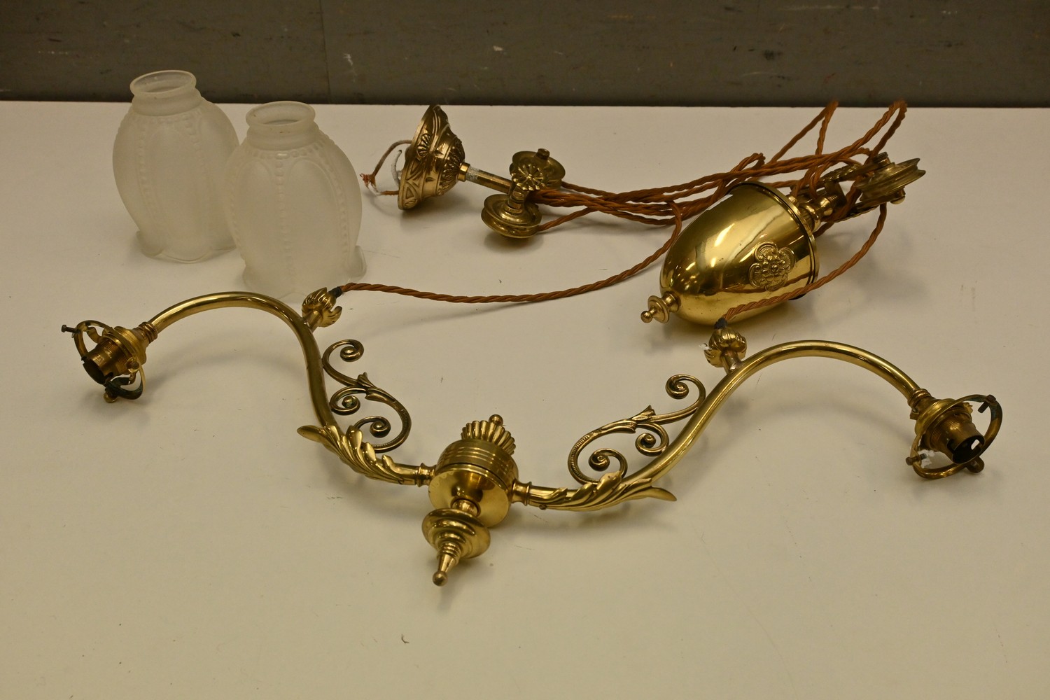 AN ORNATE BRASS TWO BRANCH PENDANT LIGHT (62W CM) (LEONARD JOEL DELIVERY SIZE: LARGE)
