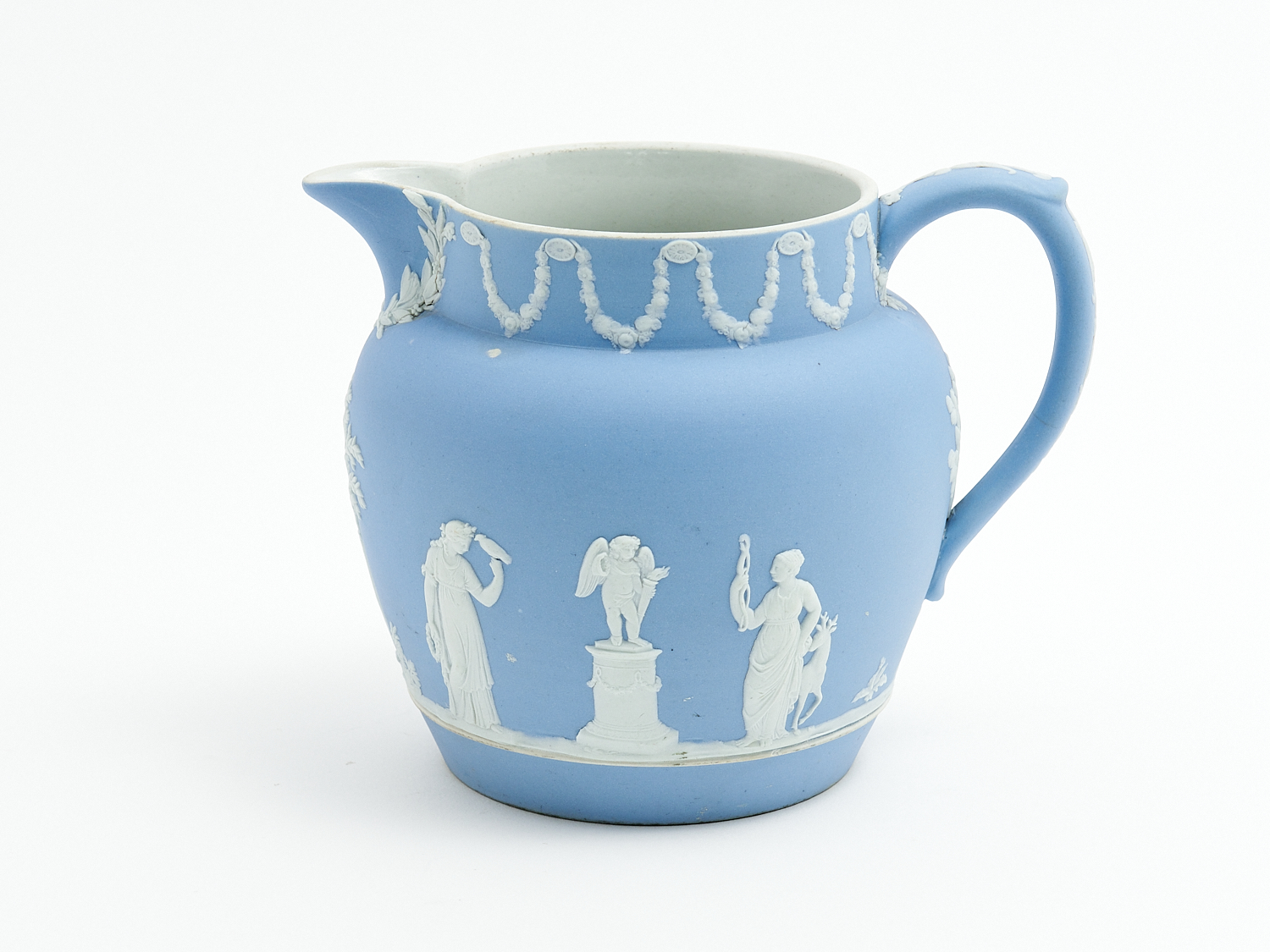 A 19TH CENTURY ENGLISH STAMPED WEDGWOOD PALE BLUE AND WHITE JASPERWARE JUG H.15CM, LEONARD JOEL LOCAL DELIVERY: SMALL