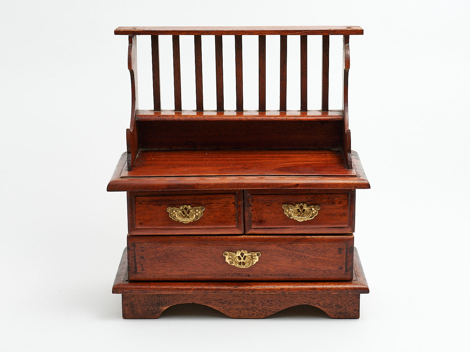 A VINTAGE THREE DRAWER APPRENTICE STYLE SIDEBOARD WITH BRASS HANDLES H. 44CM X W. 41CM X D. 21CM, LEONARD JOEL LOCAL DELIVERY: MEDIUM