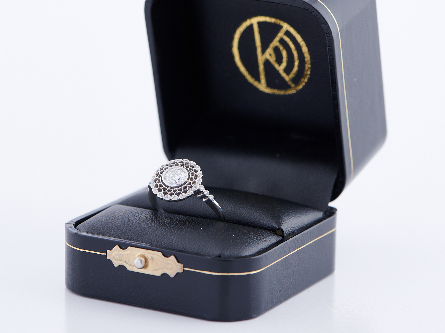 A ROUND BRILLIANT DIAMOND SET RING IN PLATINUM, FEATURING A DIAMOND SET SURROUND, THE CENTRAL DIAMOND OF 0.52CTS (H, SI1), RING SIZE L, ACCOMPANIED BY RECEIPT AND GIA CERTIFICATE