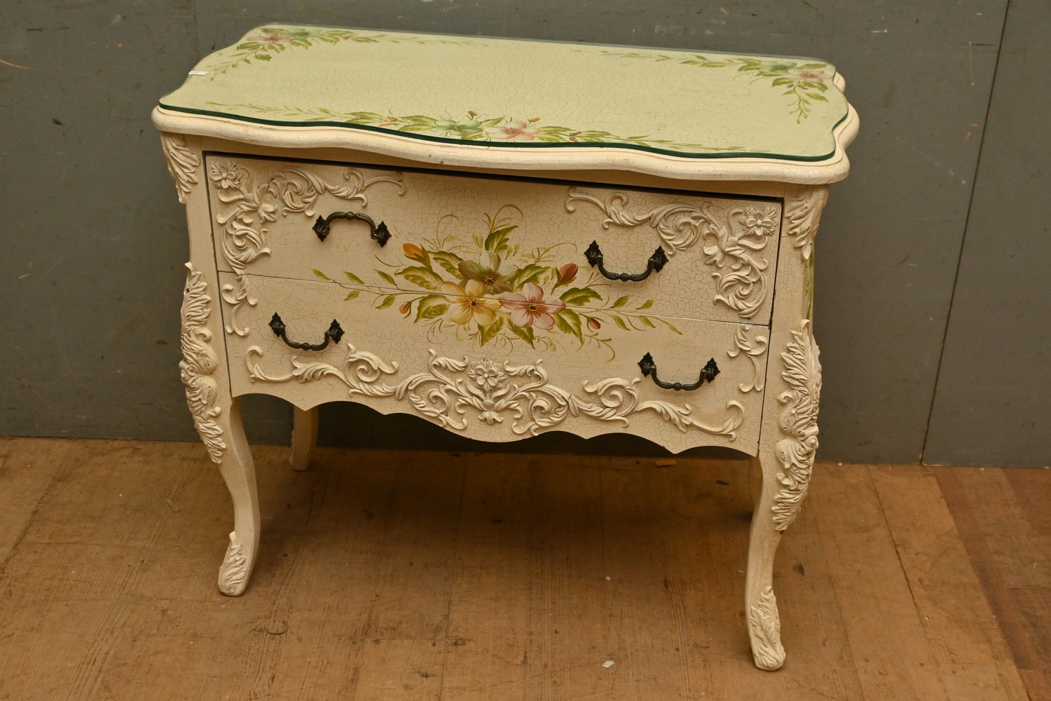 A FRENCH STYLE GLASS TOPPED HAND PAINTED TWO DRAWER CHEST (A/F) (H71 X W82 X D42 CM) (LEONARD JOEL DELIVERY SIZE: EXTRA-LARGE)
