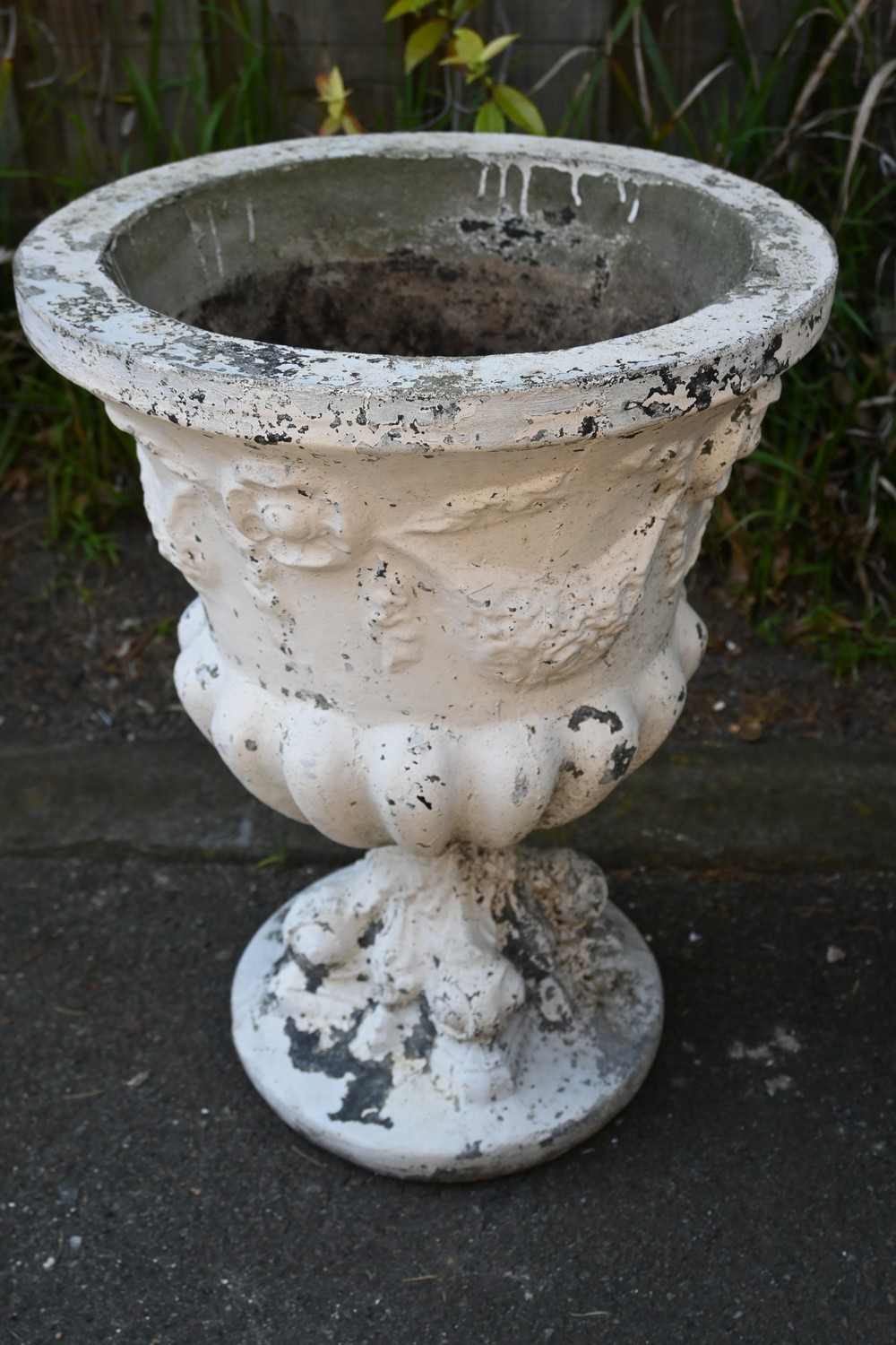 A LARGE FRENCH STYLE CONCRETE URN (62H X 46D CM) (A/F) (PLEASE NOTE THIS HEAVY ITEM MUST BE REMOVED BY CARRIERS AT THE CUSTOMER'S EXPENSE. LEONARD JOEL STAFF CANNOT ASSIST CARRYING THIS ITEM) (X-LARGE ITEM)