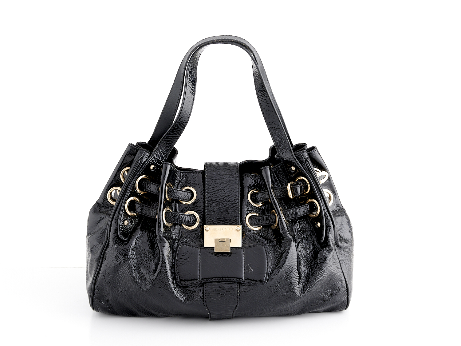 JIMMY CHOO, HANDBAG - Styled in crinkled patent leather with gold tone hardware, 41 x 24 x 12cm.