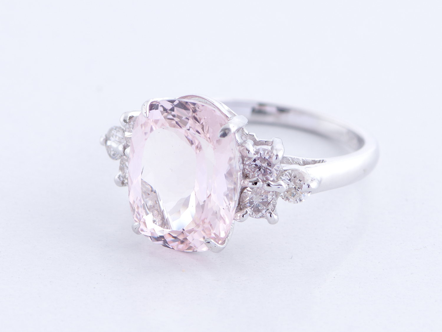 A MORGANITE AND DIAMOND SET RING IN 18CT WHITE GOLD, THE CUSHION CUT MORGANITE WEIGHING 5.12CTS, THE DIAMONDS TOTALLING 0.75CTS, RING SIZE O, WEIGHT 4.3GMS