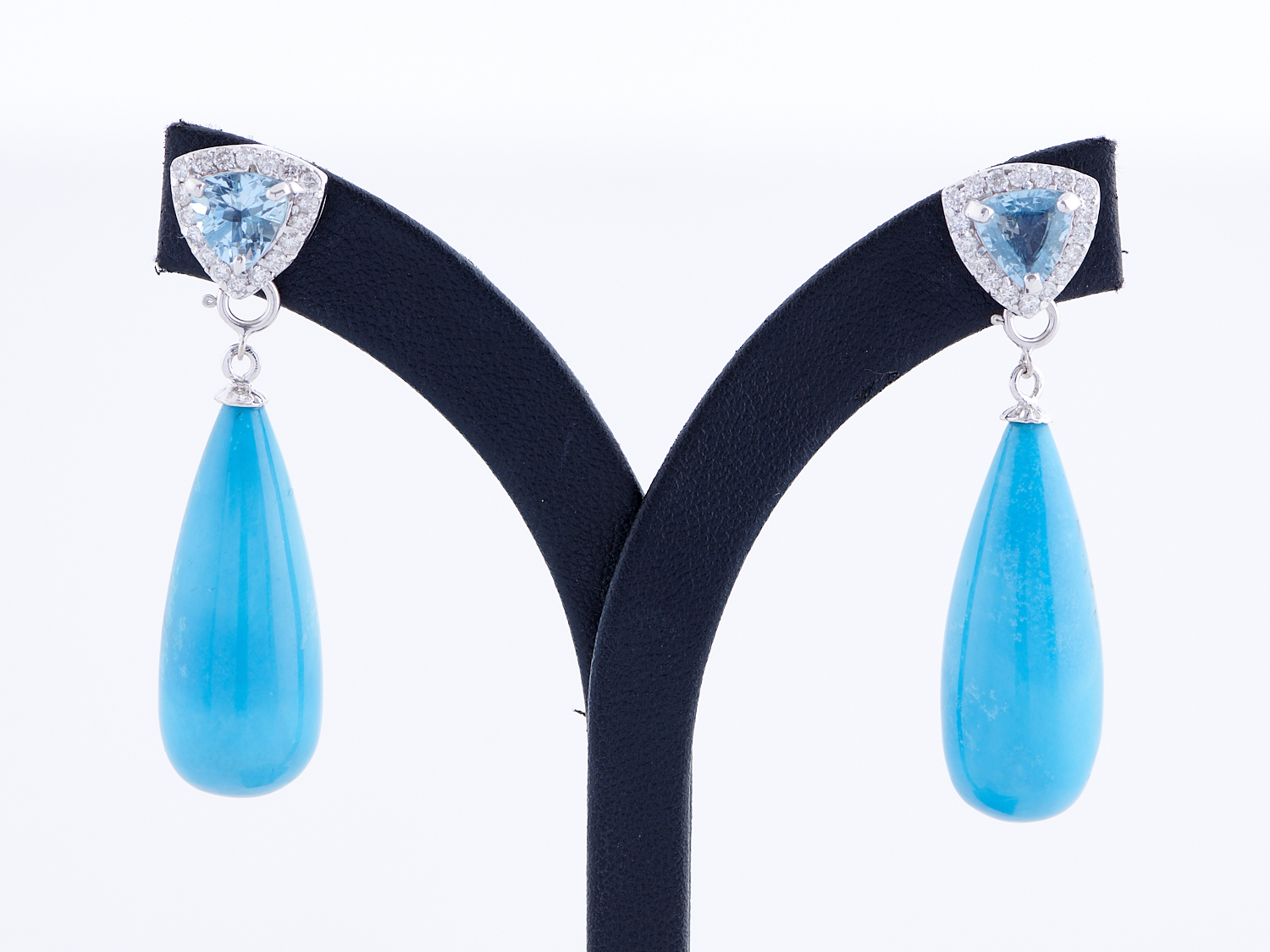 A PAIR OF DETATCHABLE AQUAMARINE, TURQUOISE (ARIZONA) AND DIAMOND SET EARRINGS TO POST AND BUTTERFLY FITTINGS IN 18CT WHITE GOLD, THE AQUAMARINES TOTALLING 2.22CTS, THE DIAMONDS TOTALLING 0.65CTS