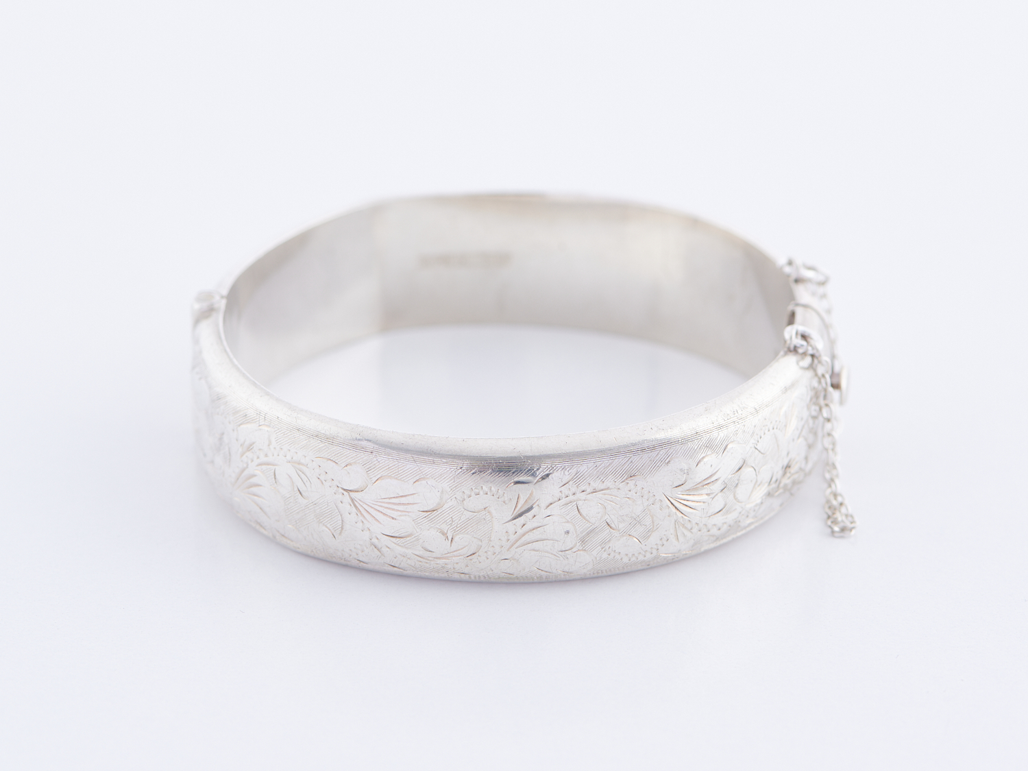 AN ENGRAVED STERLING HINGE CUFF IN STERLING SILVER, BERMINGHAM HALLMARKS, INNER MEASUREMENTS 58 X 54MM