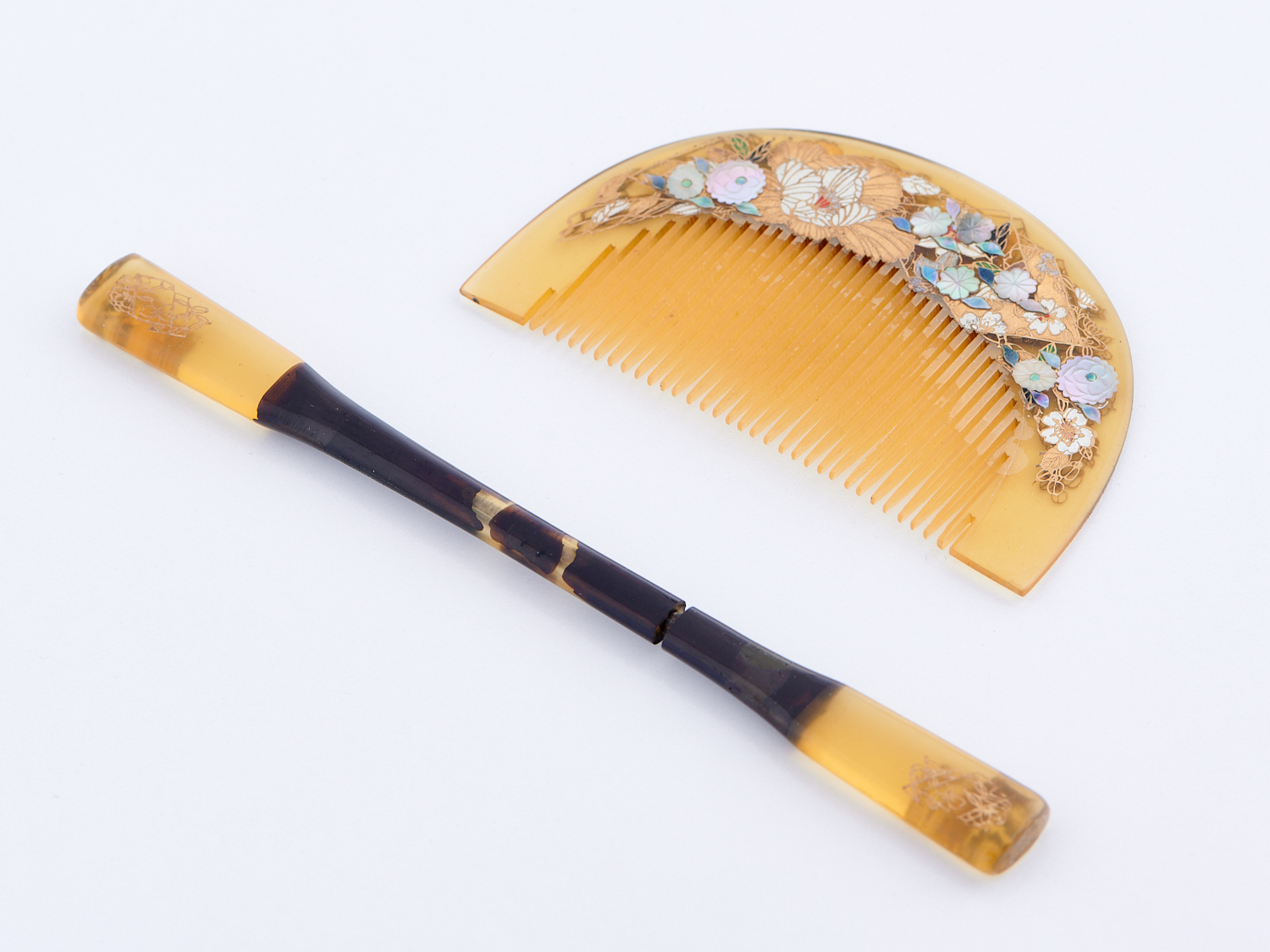 A VINTAGE JAPANESE COMB AND MATCHING HAIR PIN INLAID WITH GOLD AND MOTHER OF PEARL