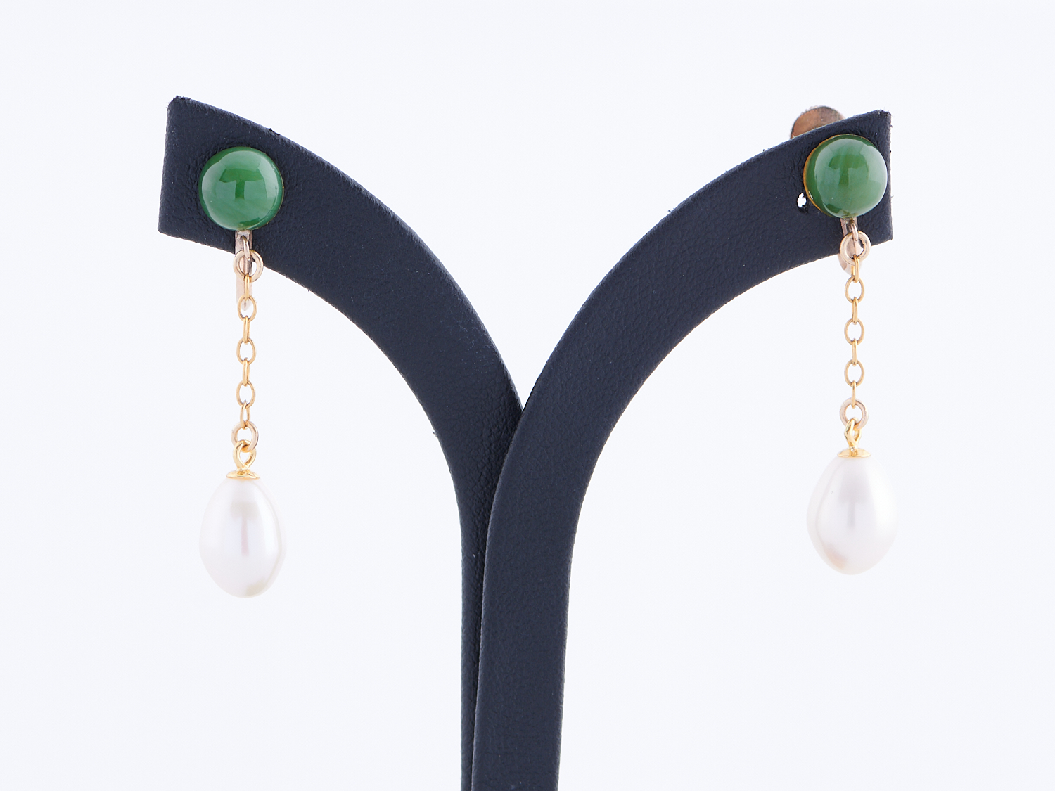 A PAIR OF VINTAGE JADE AND CULTURED PEARL EARRINGS, TO SCREW BACK FITTINGS IN 9CT GOLD AND DROP CHAIN IN GOLD PLATE, DROP LENGTH 39MM